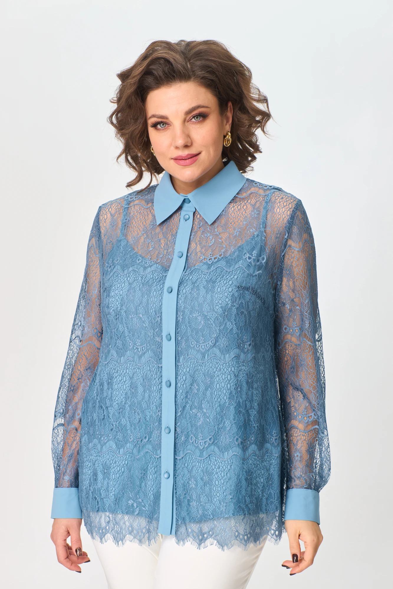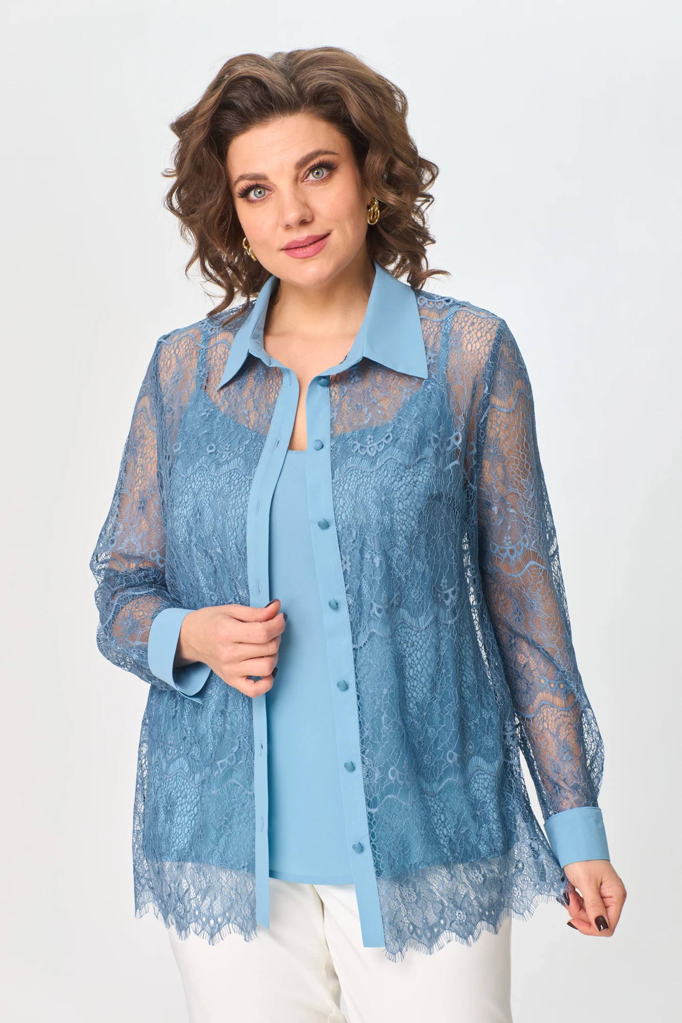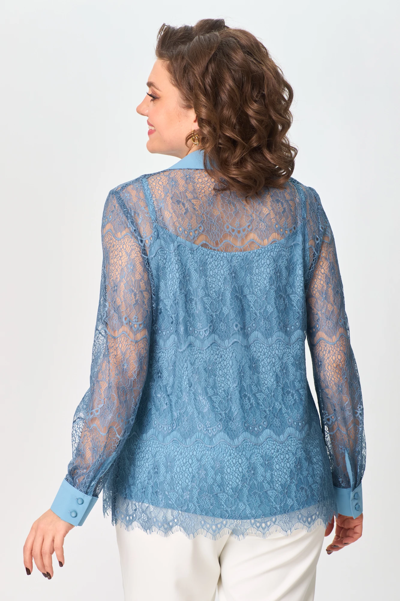 48,50,52,54,56Блузка выполнена из кружевного полотна с элементами из однотонной ткани. Топ выполнен из однотонной ткани.