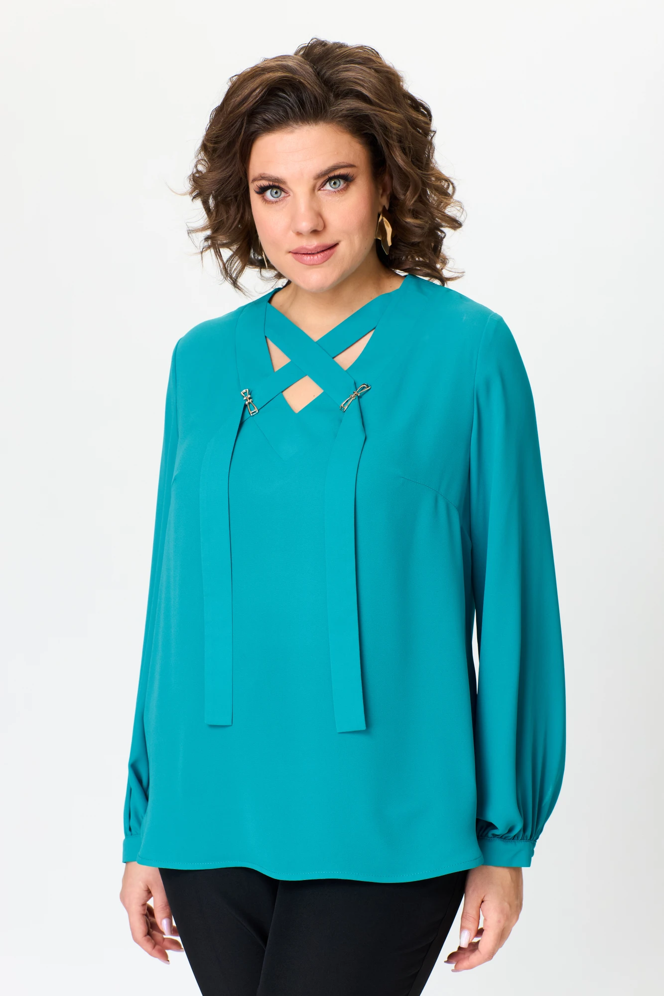 60Полочка блузки с нагрудными вытачками и горловиной V-образной формы с декором из лент продетых в пряжки. Спинка цельная.
