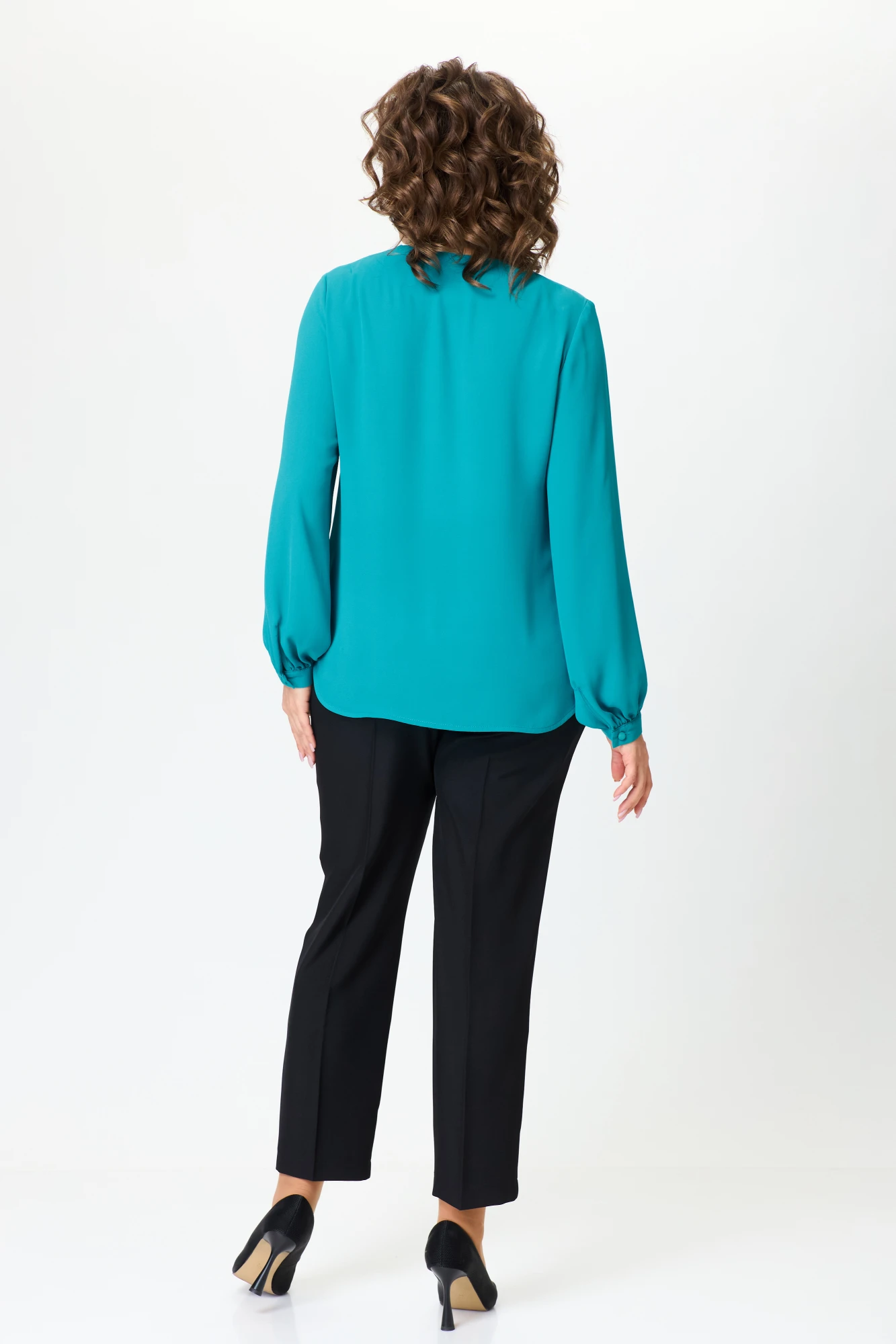 Рукав втачной, одношовный, длинный. По низу рукав со сборкой и на притачной манжете с застежкой на петлю и пуговицу. Низ блузки с закругленными краями в области боковых швов.