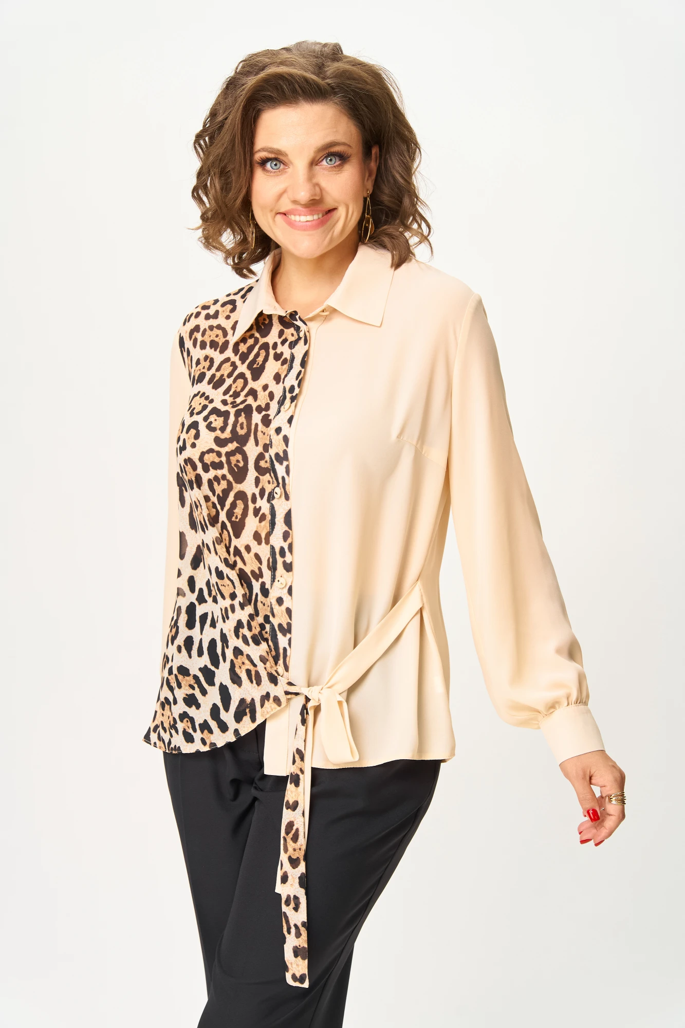 Блузка прямого силуэта, для любительниц быть в центре внимания, с акцентной ассиметричной полочкой создаст эффектный образ. Блузка выполнена из однотонной струящейся блузочной ткани типа креп-шифона, в сочетании с тканью с набивным рисунком. Полочка блузки с центральной застежкой на петли и пуговицы по планке. Левая и правая полочки ассиметричны. Правая полочка с нагрудной вытачкой. Левая полочка с элементом драпировки и поясом завязывающимся с левой стороны. Воротник рубашечного типа, стояче-отложной. Спинка цельная. Рукав одношовный, длинный, по низу со сборкой и на притачной манжете с застежкой на петли и пуговицы.