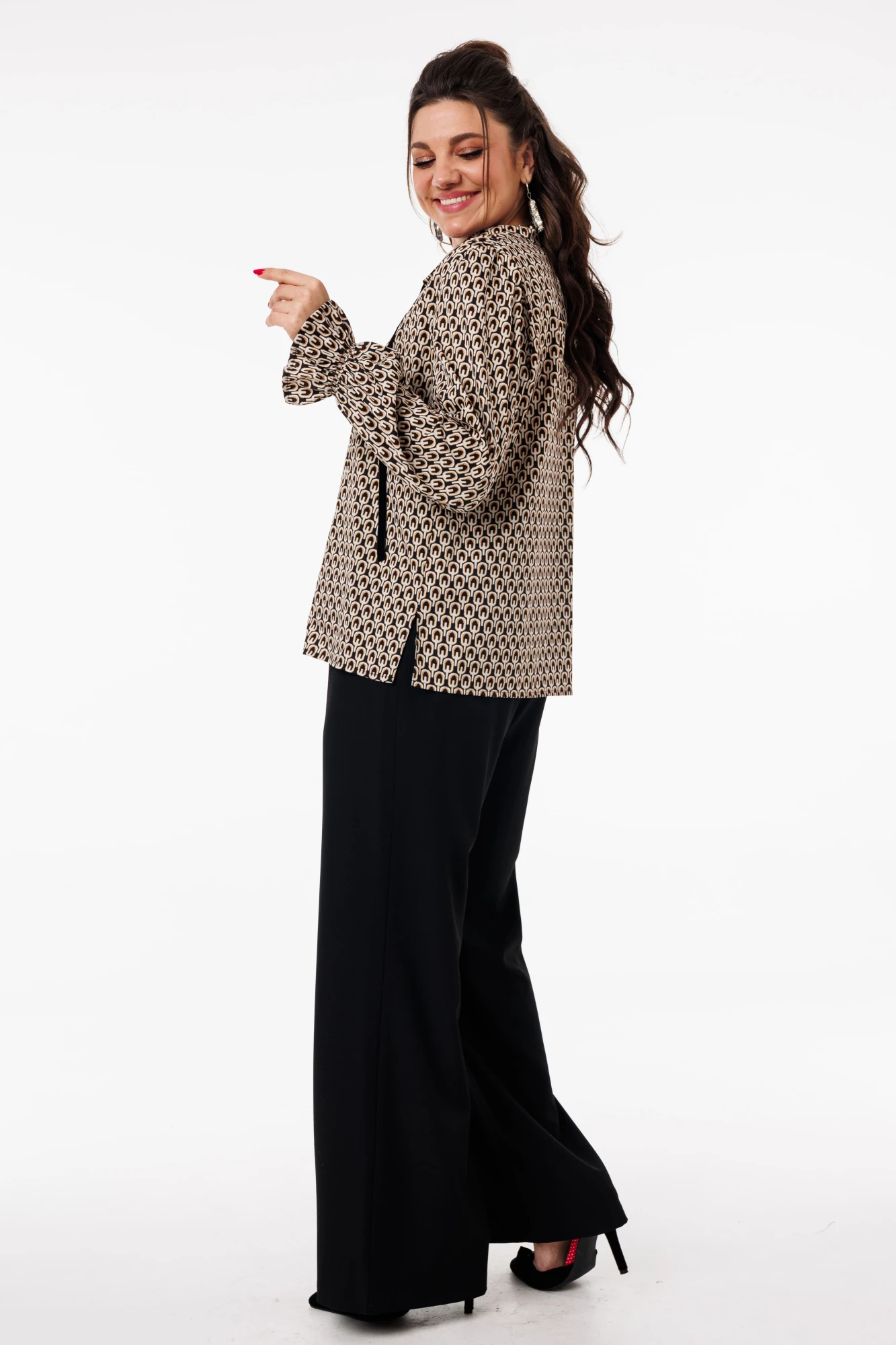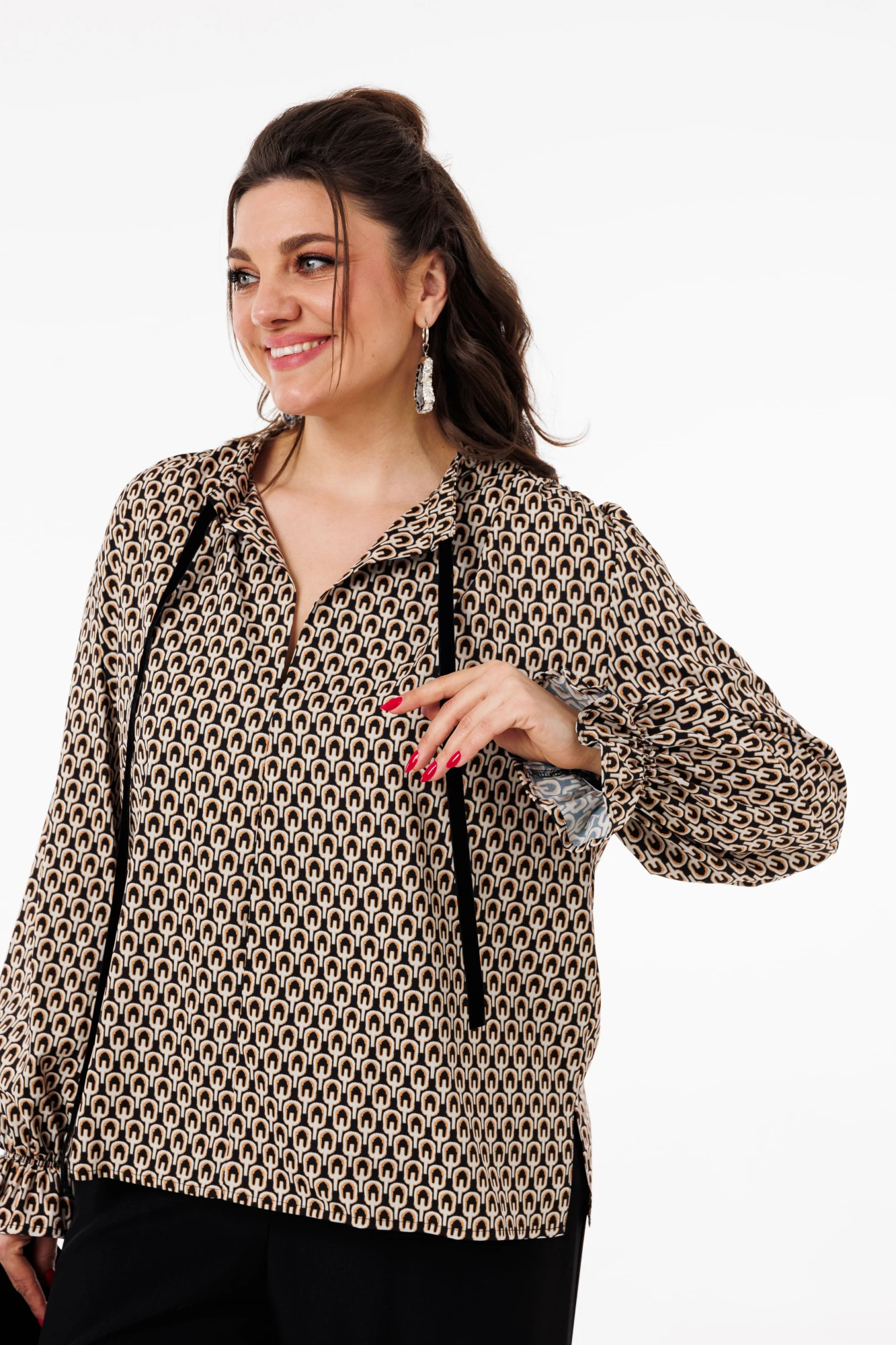 Длинные втачные рукава свободного кроя украшены сборкой по низу и декоративными завязками, добавляя нотку игривости и оригинальности. Воротник-стойка, отделанный бархатной тесьмой, придает блузе особый шарм и утонченность.