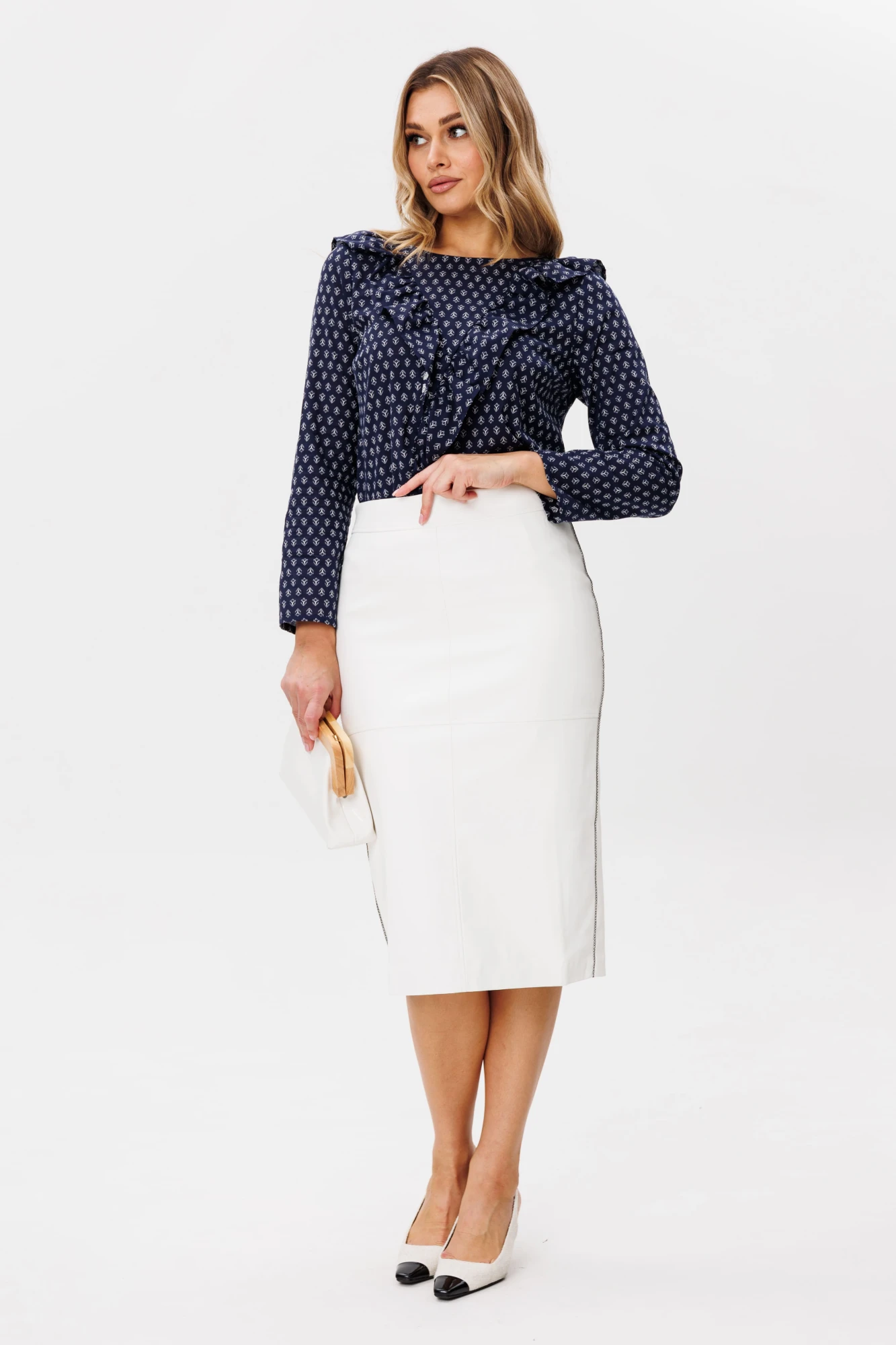 48Передняя часть украшена V-образной кокеткой, которая плавно переходит в асимметричный рюш, создавая эффектный переход на спинку. Вырез на спинке также имеет V-образную форму, в то время как передняя часть завершена округлым вырезом, подчеркивающим линию шеи.