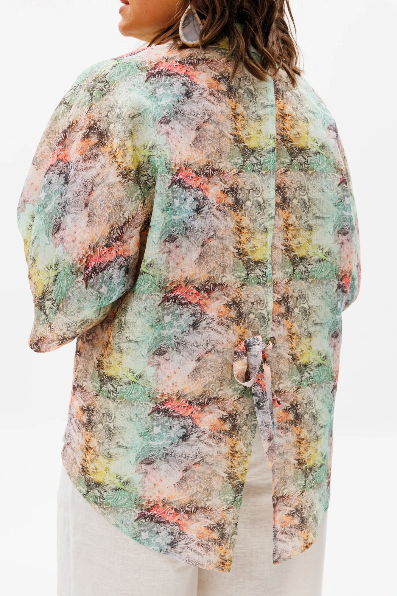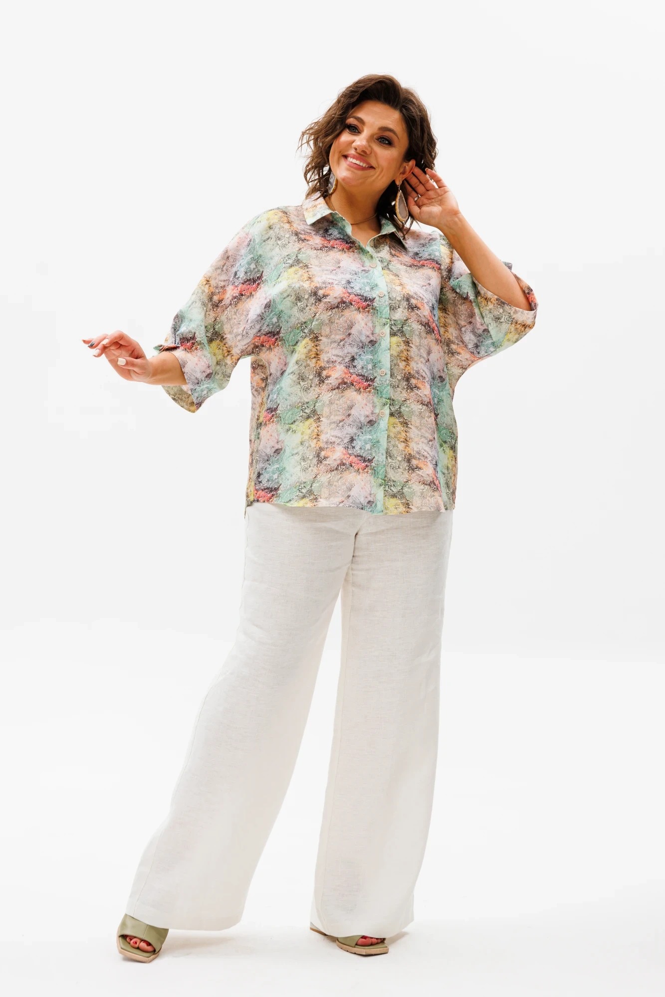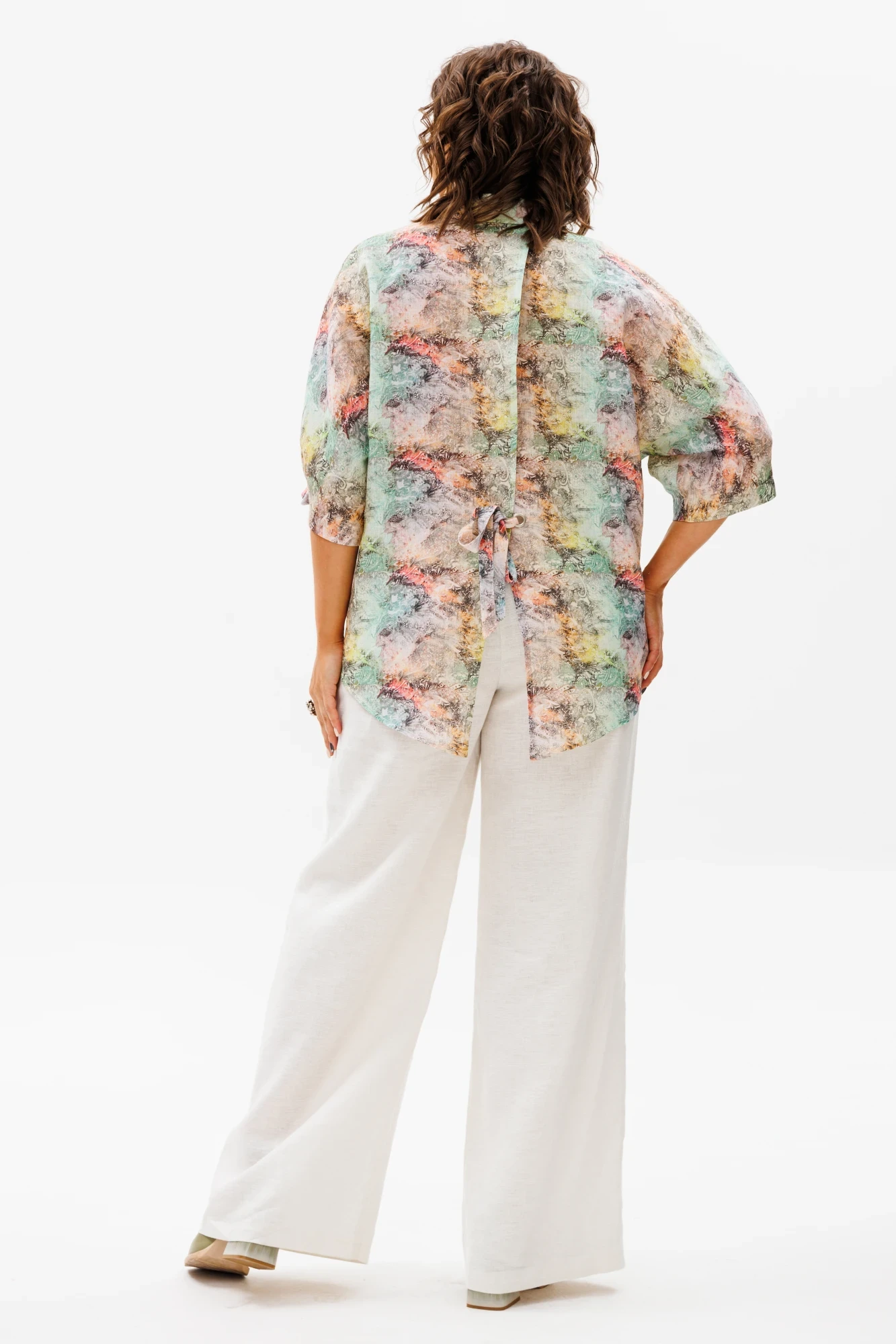 На модели льняные брюки 1425.2. Приобретайте брюки и блузу по отдельности или костюмом под артикулом 1465.