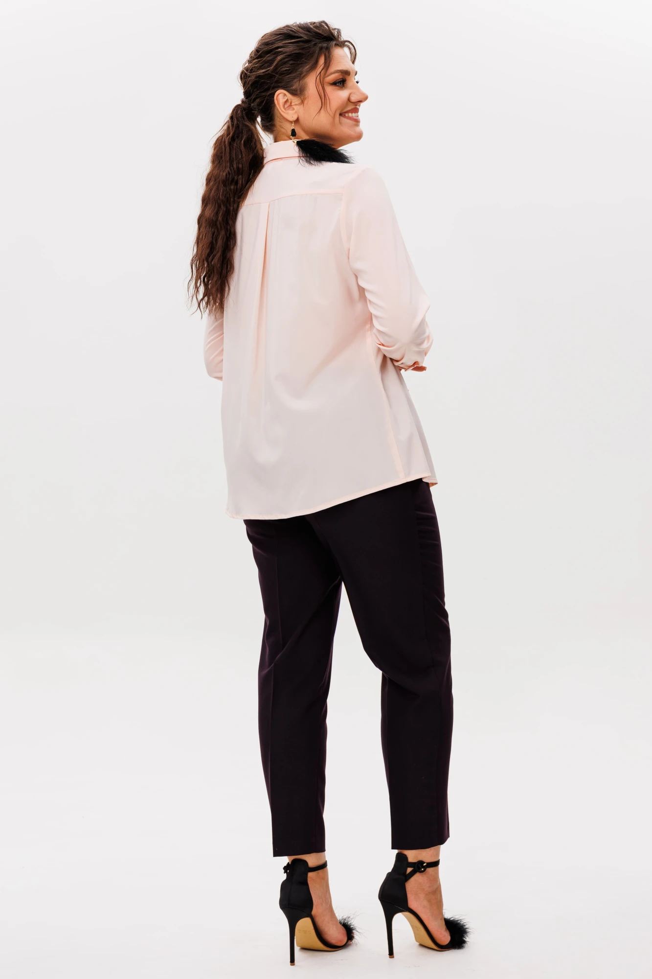54Центральная складка на спинке добавляет динамики, оживляя силуэт при движении. Длинные рукава с аккуратными манжетами, застегивающимися на пуговицу, подчеркивают продуманность каждой детали. Сплошная застежка на пуговицы вдоль всего полотна позволяет варьировать степень открытости, адаптируя образ к разным ситуациям.