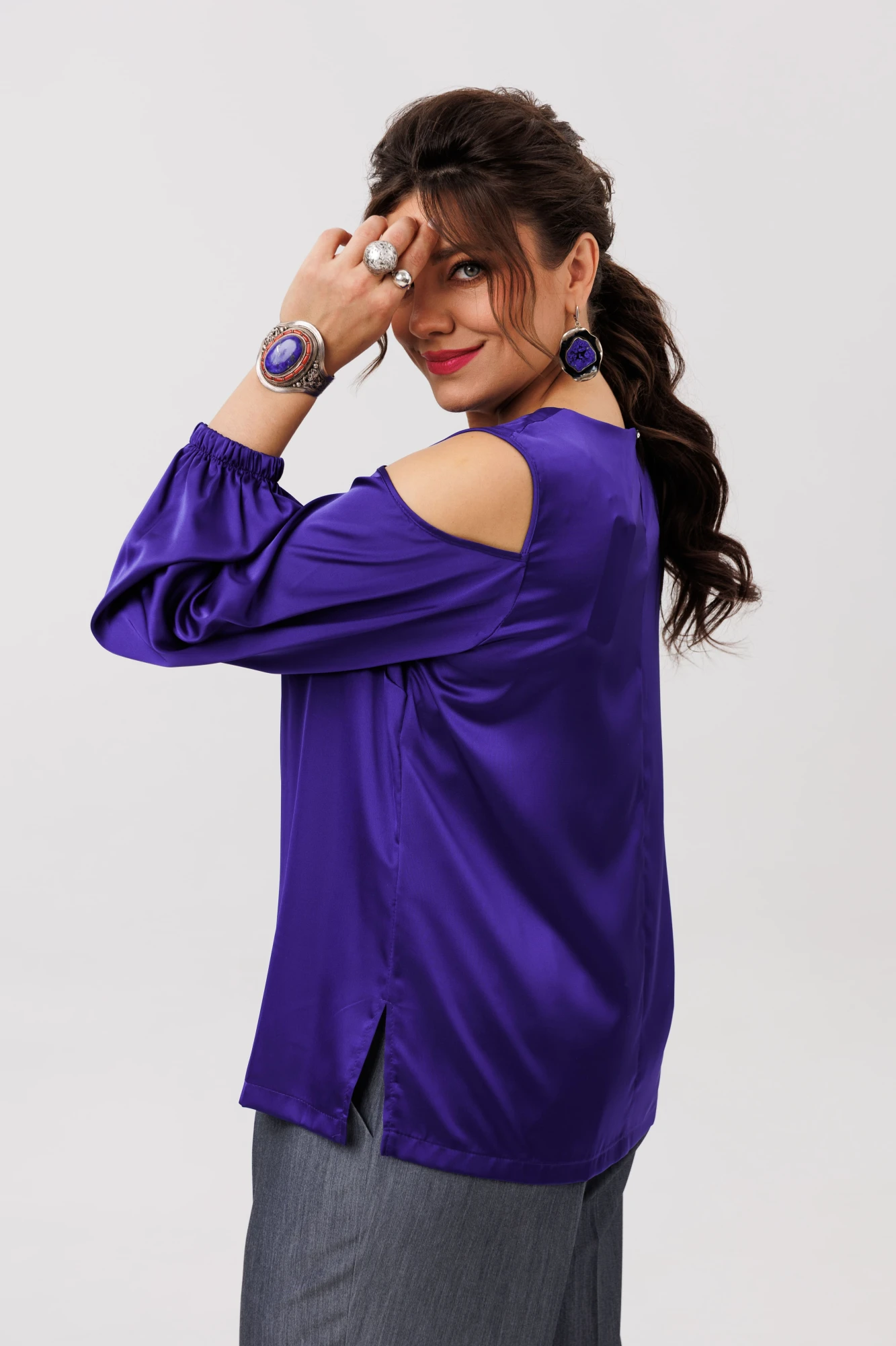 60,62Широкий длинный рукав, мягко собранный на резинке, создаёт элегантный объём, а открытое левое плечо вносит ноту игривого кокетства. Сочный оттенок «индиго» наполняет образ энергией и яркой эмоцией, делая его по-настоящему запоминающимся.