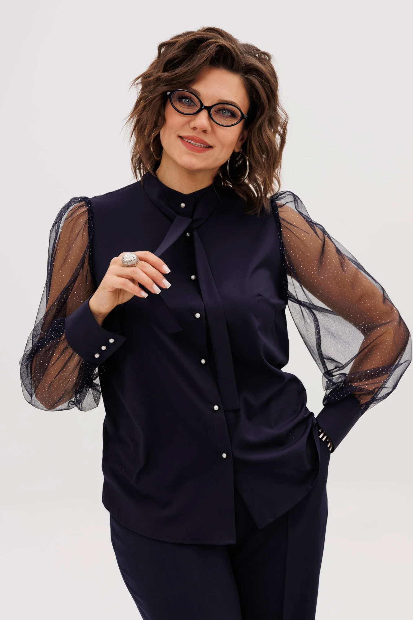 48, 50 , 52Ее главная особенность — втачные рукава из легкой сетчатой ткани с мерцающим напылением. Рукав пышно расклешен от линии лепты, где мягко присборен, что создает объем и романтичный образ. Низ каждого рукава аккуратно завершается манжетом на застежке-пуговице, добавляя классический штрих.