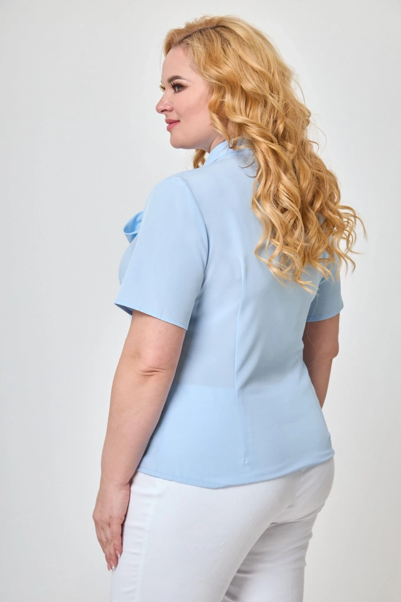 52,54Полуприлегающий силуэт, французские нагрудные вытачки, втачной рукав на манжете, У-образный вырез горловины с притачным воротником-стойкой, переходящий в изящный завязывающийся бант или галстук и застежкой на пуговицы из перламутра, эластичная легкая ткань.