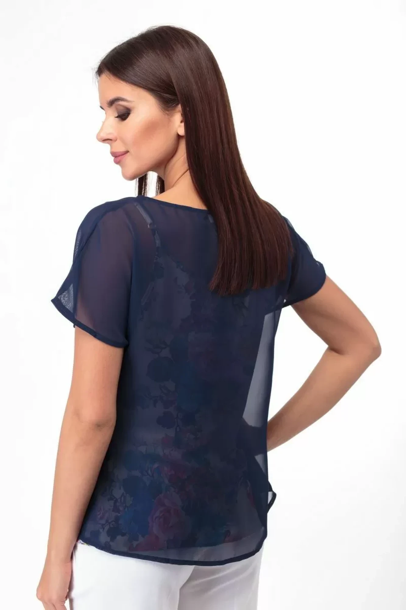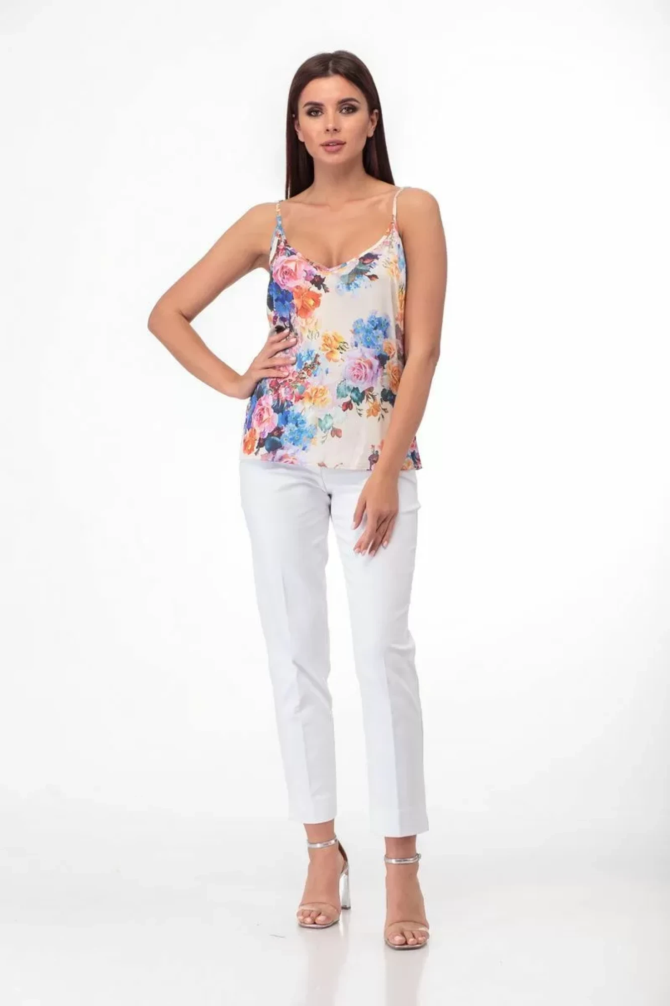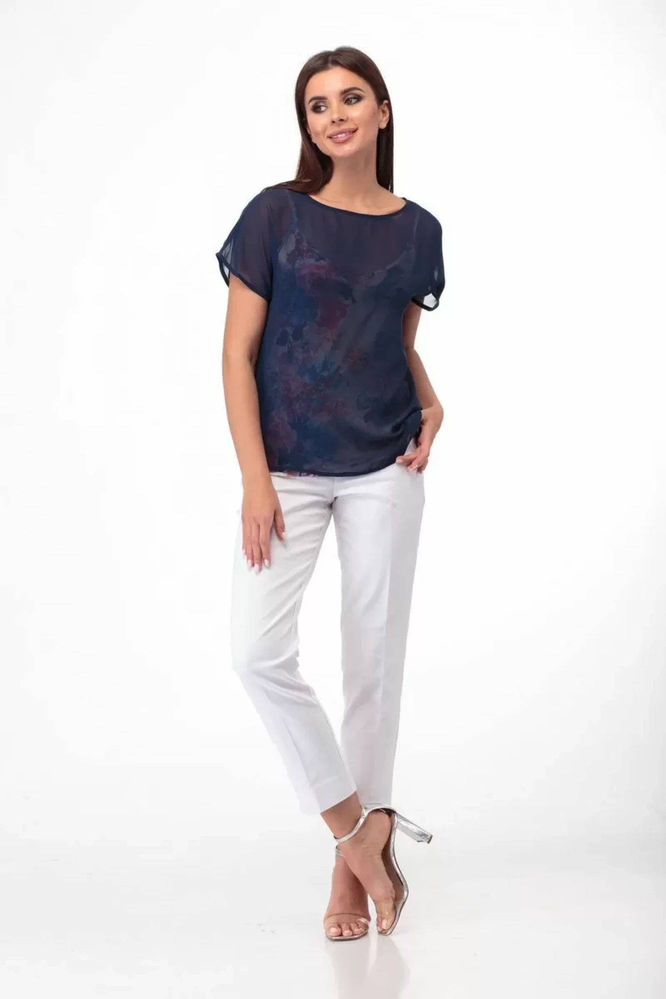 Шелковый топ комфортного объема, прямого силуэта с нагрудными вытачками, с регулируемыми бретелями дополняется шифоновым топом со спущенной линией плеча, свободного прямого силуэта, с нагрудными вытачками, горловиной "лодочка".