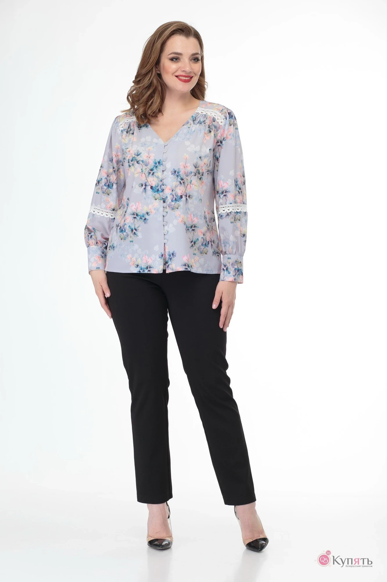 56,58,60Перед и спинка с романтичными кокетками и кружевными вставками, v-образный вырез горловины, застежка на навесные петельки и пуговицы. Втачной рукав на манжете и кружевной вставкой.
