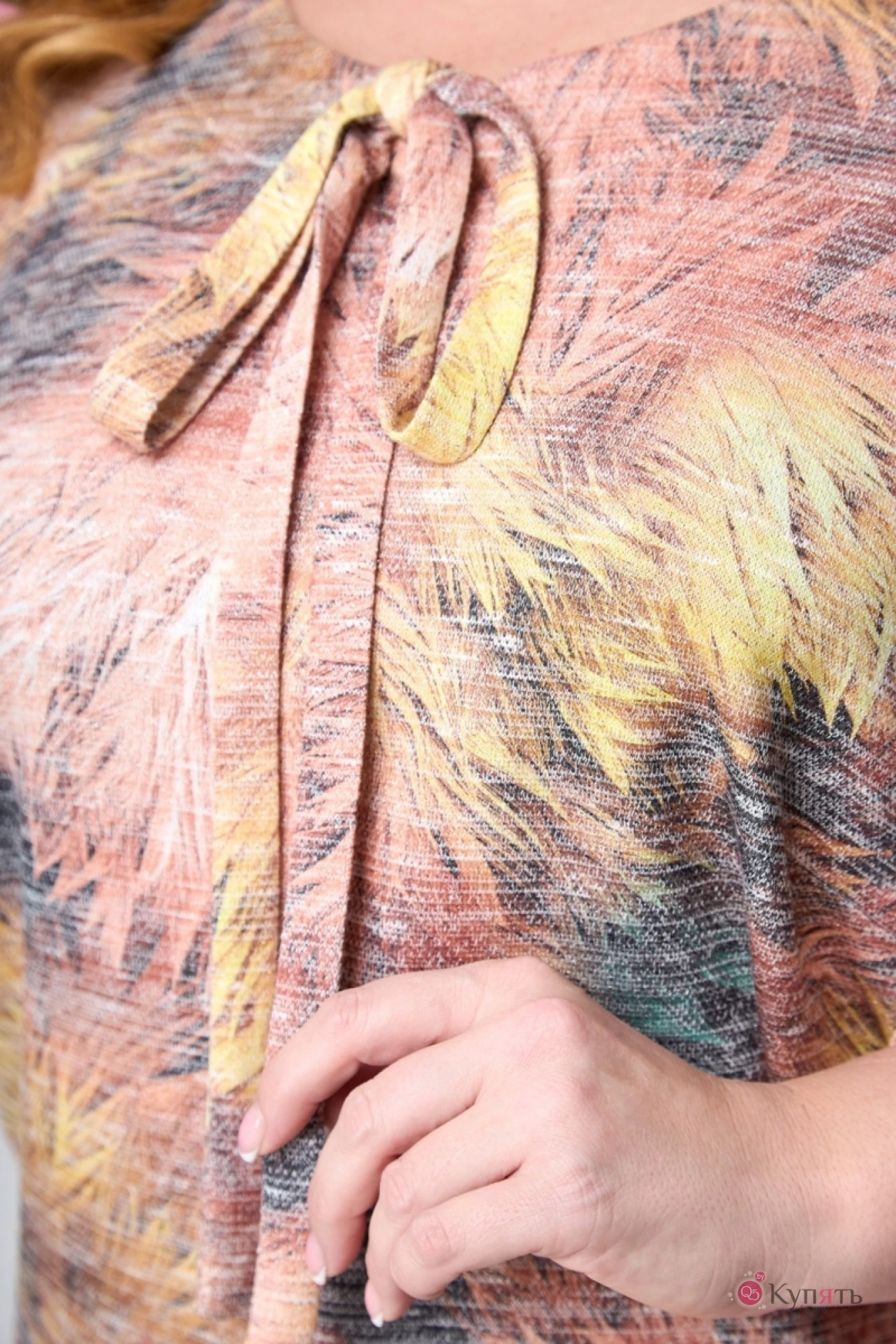 По переду выполнены нагрудные вытачки, линия плеча удлинена, что обеспечивает отличную посадку на любой фигуре, рукава свободные, укороченные, кокетливо присобраны вверху, по низу собраны на резинку.
