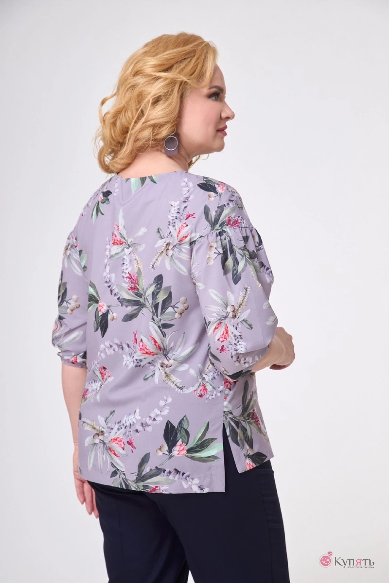По переду выполнены нагрудные вытачки, линия плеча удлинена, что обеспечивает отличную посадку на любой фигуре, рукава свободные, укороченные, кокетливо присобраны вверху, по низу собраны на резинку.