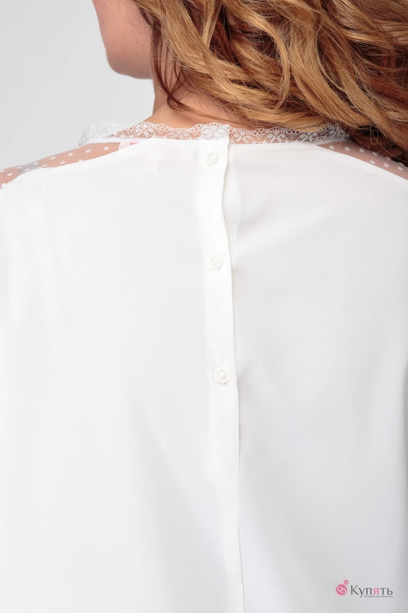 Прямой силуэт. По переду и спинке кружевные кокетки. Втачной рукав на манжете также имеет отделочные детали из кружевного тончайшего полотна. Округлый вырез горловины с отделкой из кружева. Застежка на пуговицы в среднем шве спинке.
