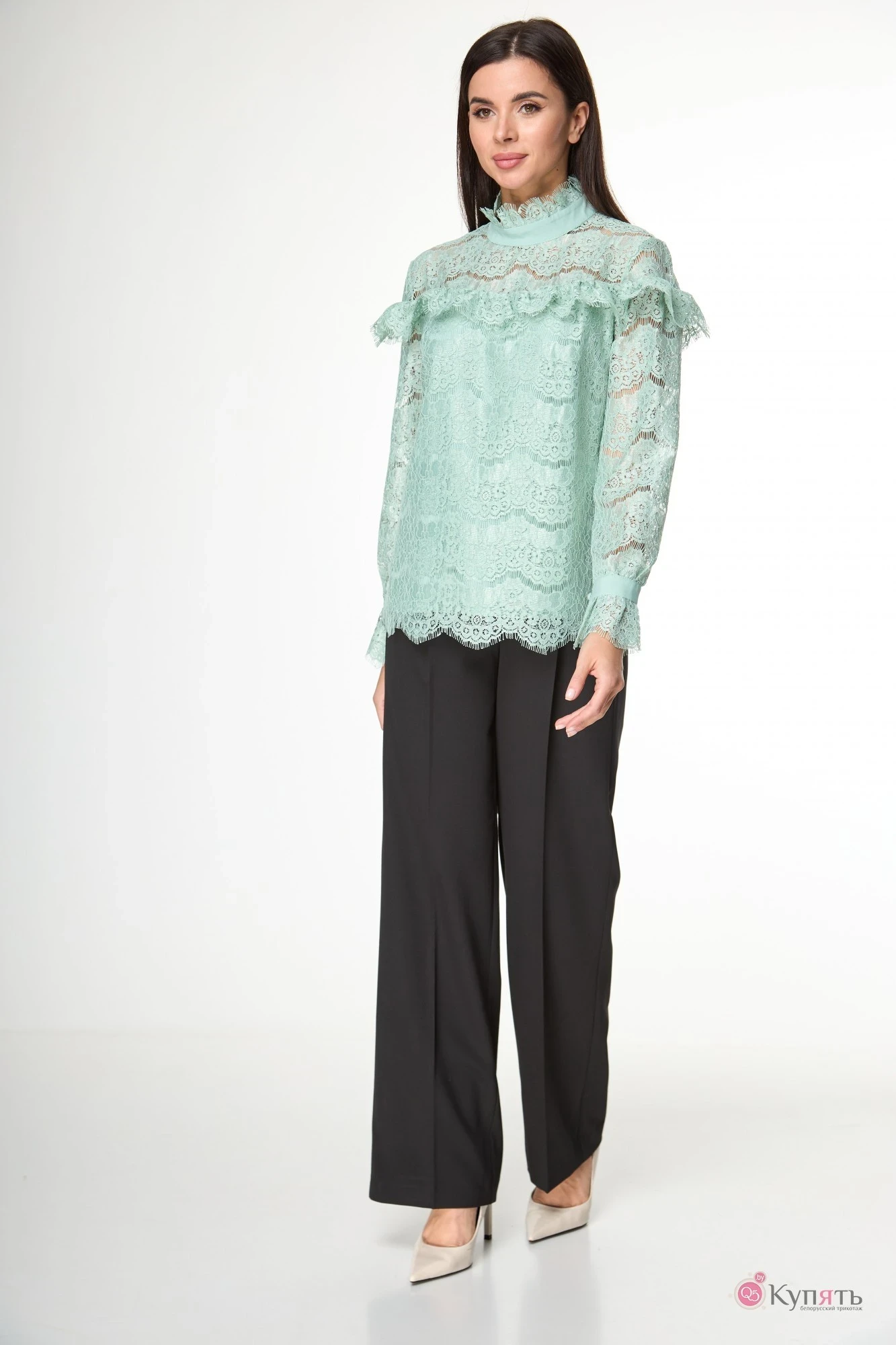 Прямой силуэт и красивые конструкторские элементы:отрезные кокетки по переду и спинке подчеркнуты воланом,воротник-стойка с отделкой из кружева,втачные рукава с королевскими манжетами.Застежка по стойке сзади на пуговицы с навесными петельками.Перед и спинка от линии кокеток выполнены с наложением кружева на блузочную ткань в идеальном цветовом решении.