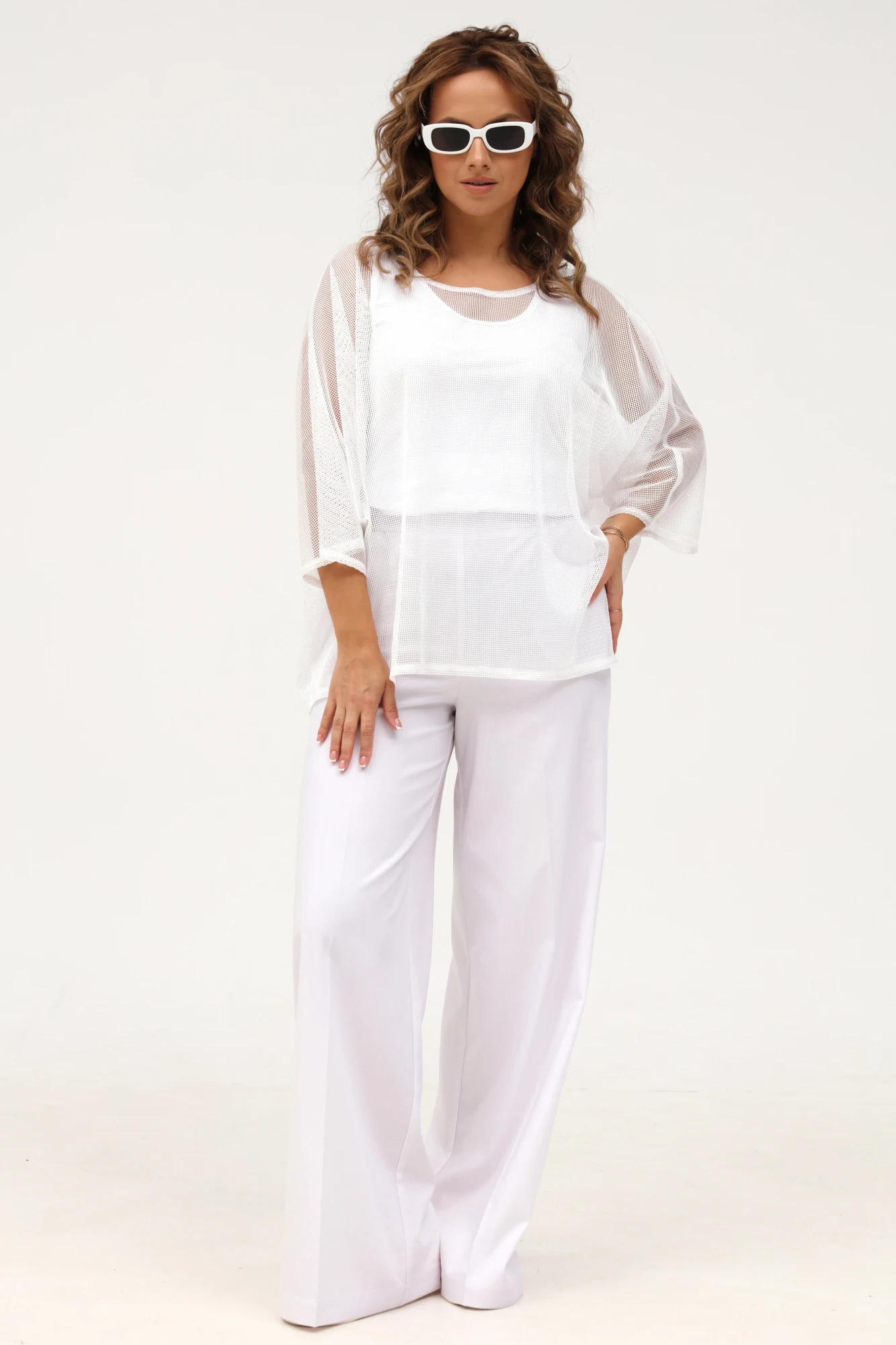 Удлиненная блузка свободного кроя выполнена из сетки белого цвета с округлым вырезом горловины. Рукав цельнокроеный длинной 3/4. В комплекте с прилегающим топом без рукава."