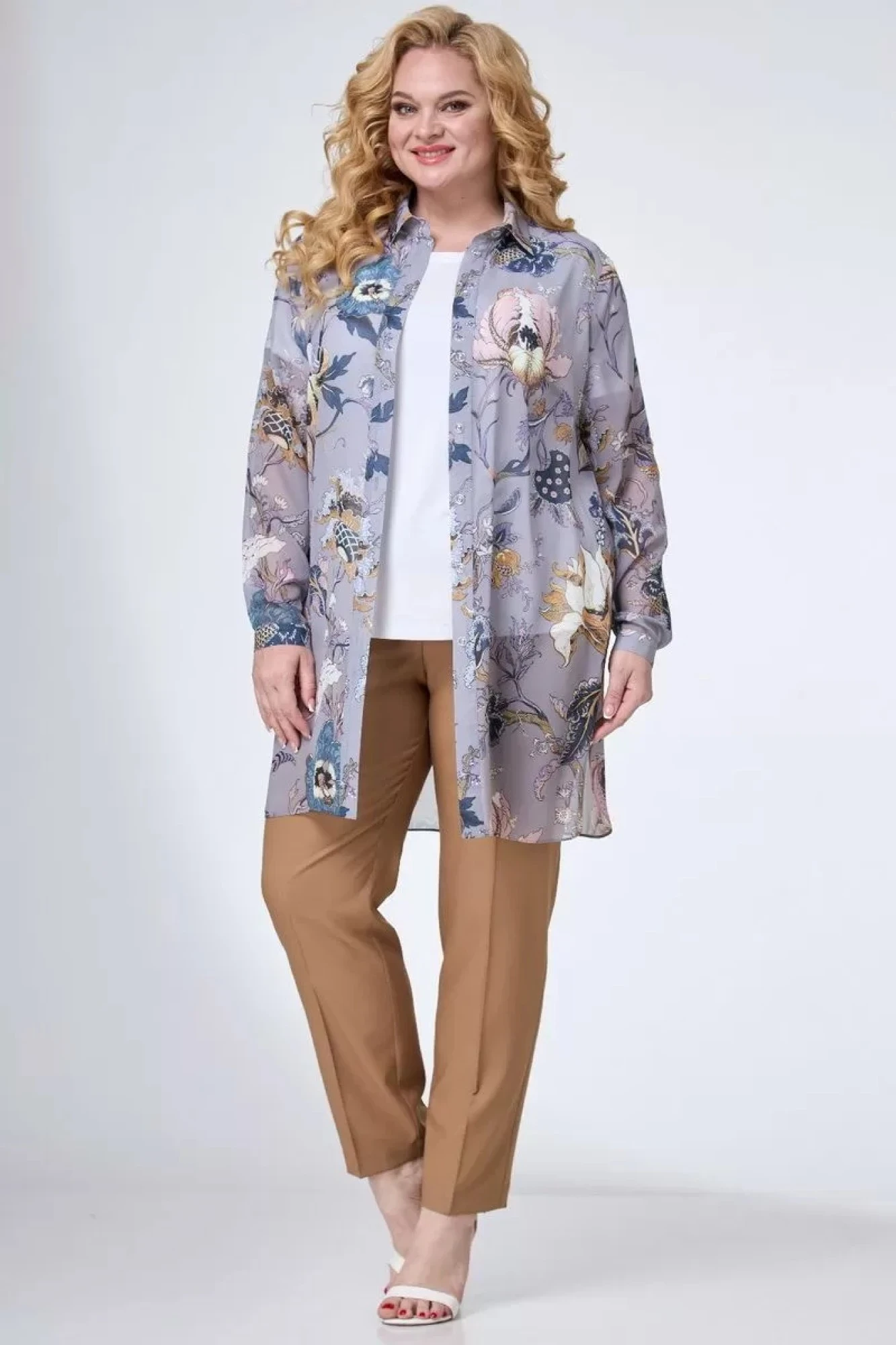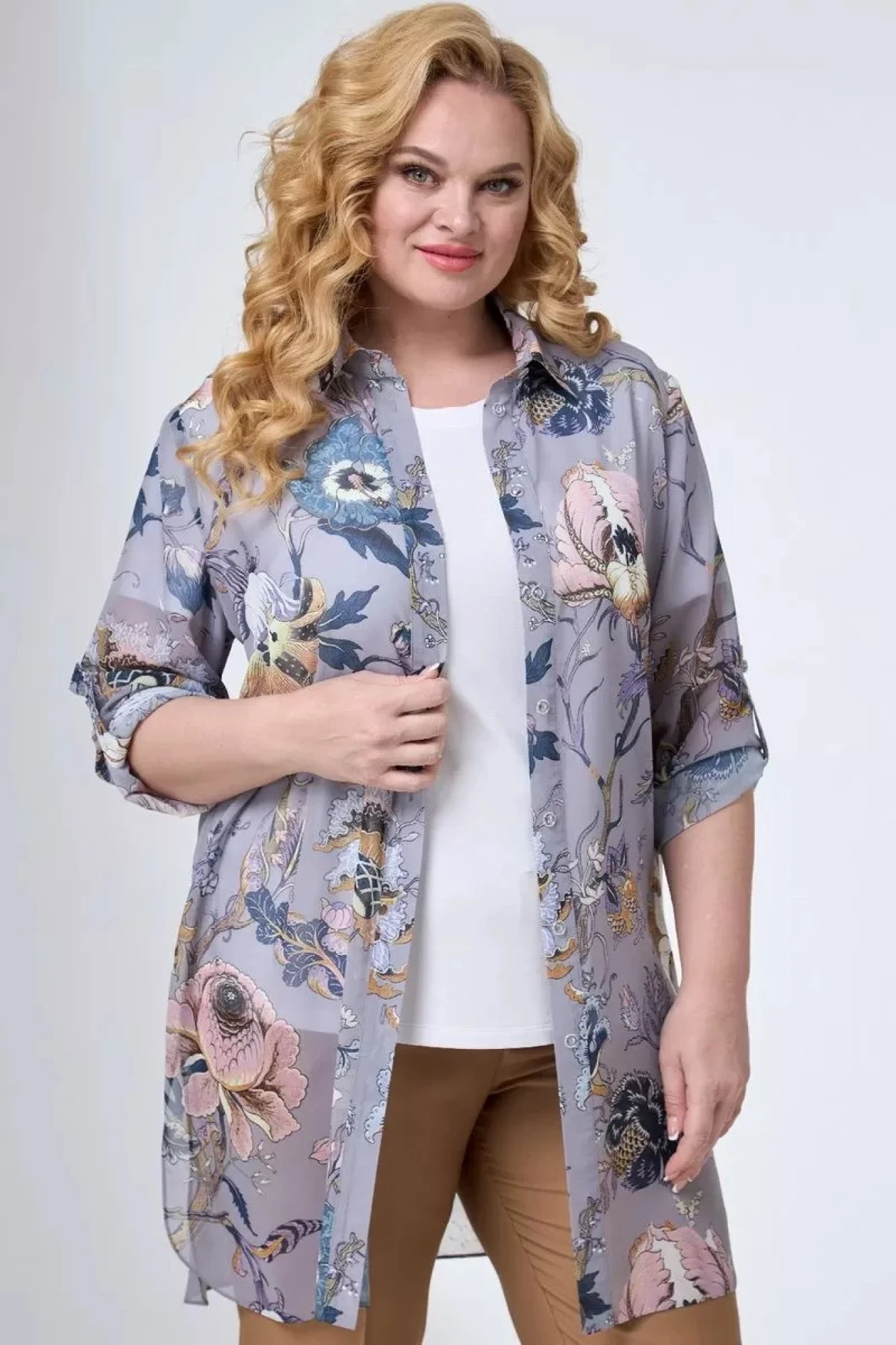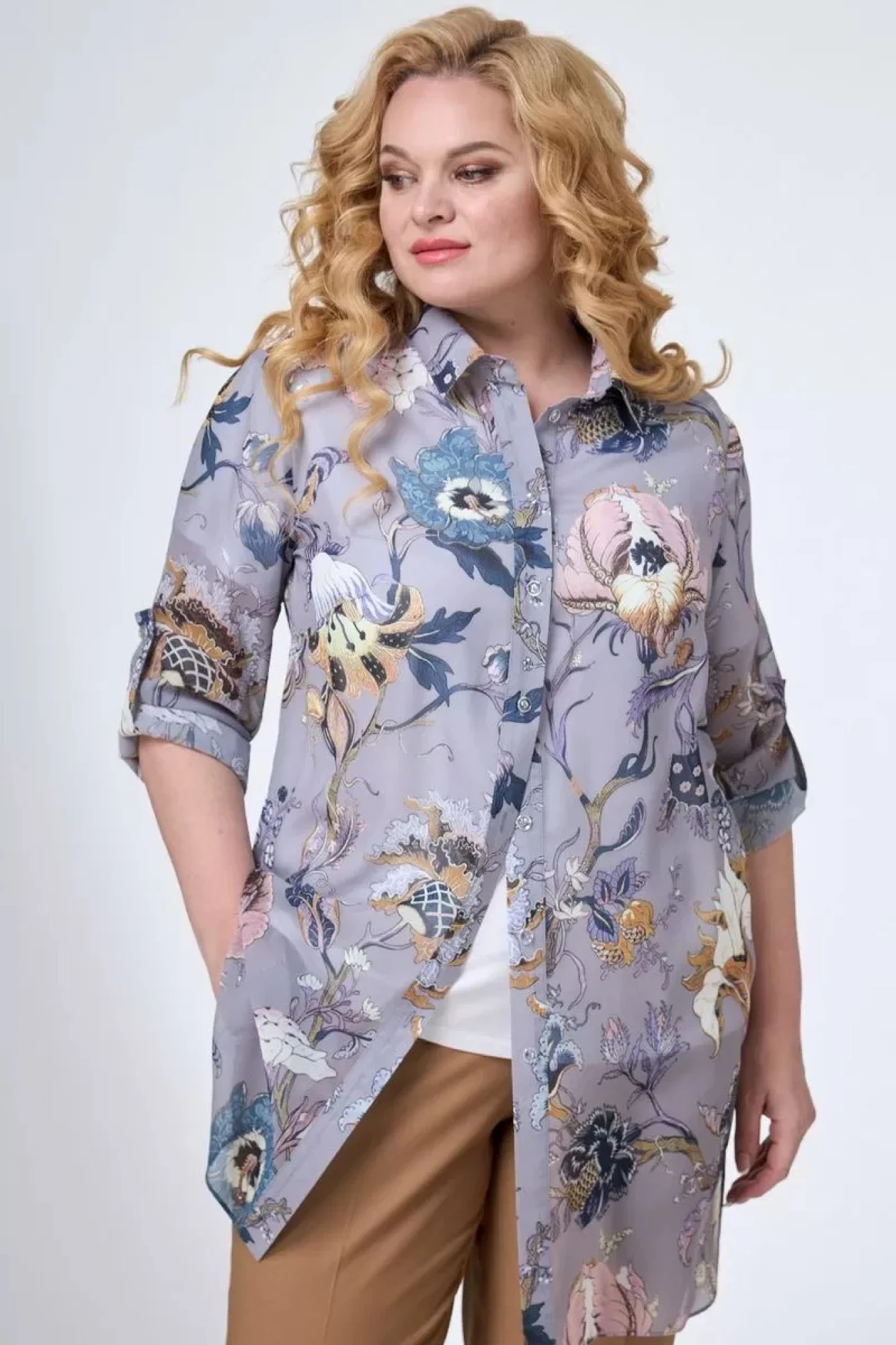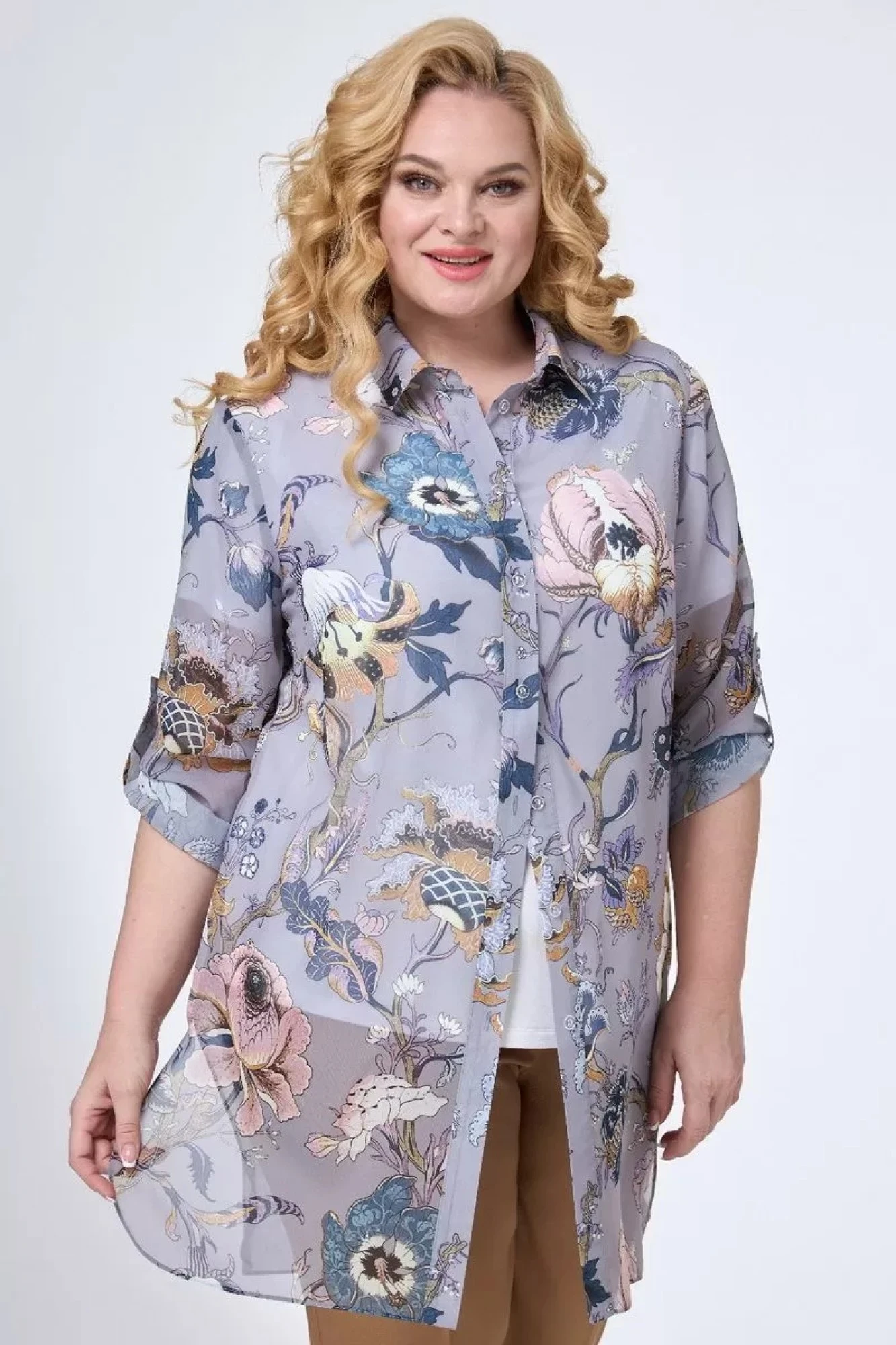 46,48, 50 ,52,54, 56Блузка удлиненная прямого силуэта из шифоновой ткани. Воротник рубашечного типа на притачной стойке. Перед с центральной застежкой на петли и пуговицы на притачных планках. В боковых швах - разрезы. Рукав втачной длинный, с патой и на манжете с застежкой на пуговицу.