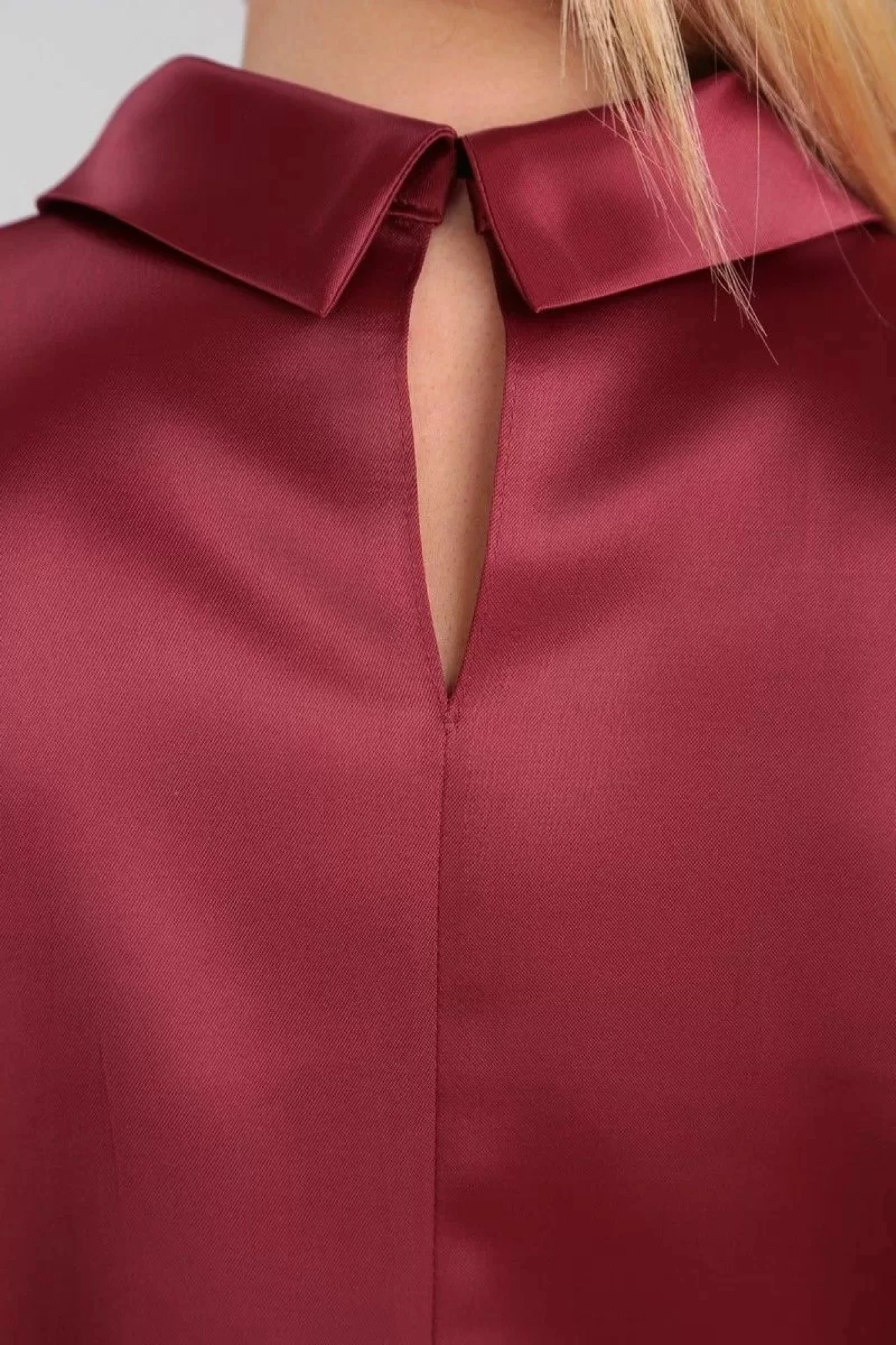 Блузка прямого силуэта. Горловина обработана отложным воротником-стойкой, по переду расположены симметричные складки и декоративная капелька, по спинке с застежкой на навесную петлю и пуговицу. Спинка со средним швом. Рукав втачной прямой длинный, по низу со сборкой и манжетой с застежкой на петлю и пуговицу. "