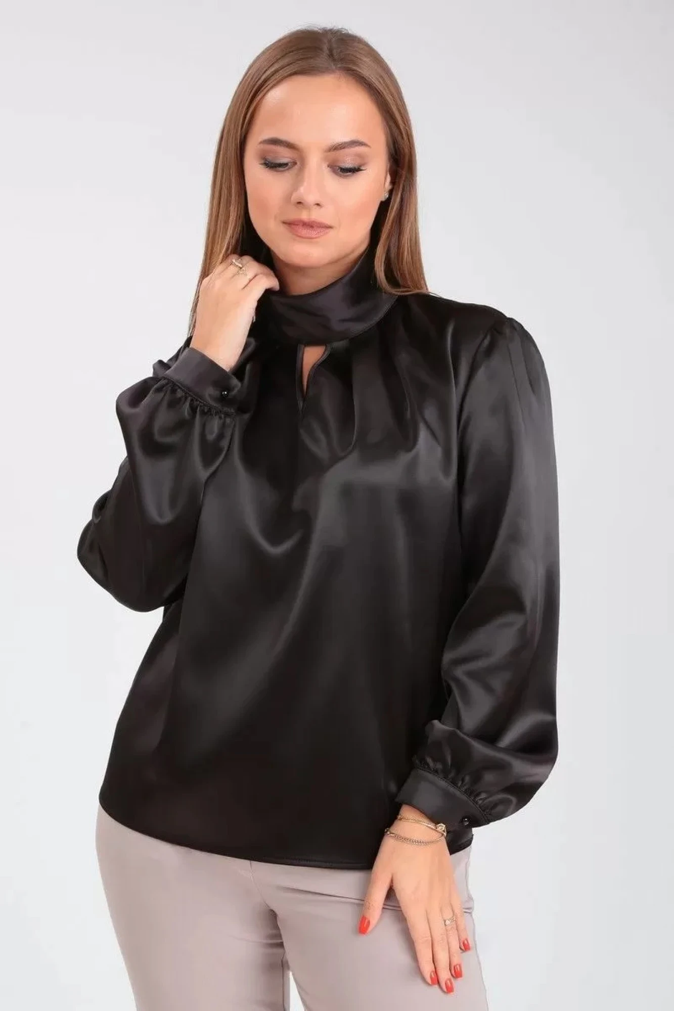 48, 50 , 52 ,54,56Блузка прямого силуэта. Горловина обработана отложным воротником-стойкой, по переду расположены симметричные складки и декоративная капелька, по спинке с застежкой на навесную петлю и пуговицу. Спинка со средним швом. Рукав втачной прямой длинный, по низу со сборкой и манжетой с застежкой на петли и пуговицы.