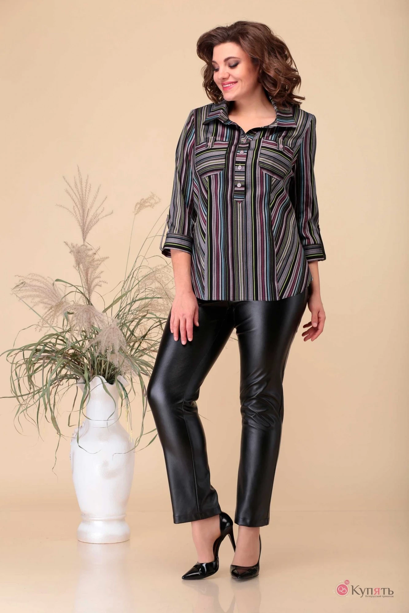 Очень стильная блузка.На 56 размер легла впритык,возможно за счет стрейчевой ткани,которая стягивает.Ткань жестковата,но смотрится презентабельно.Рекомендую.
