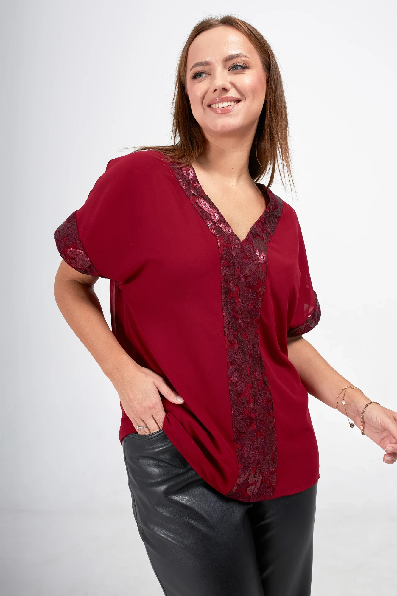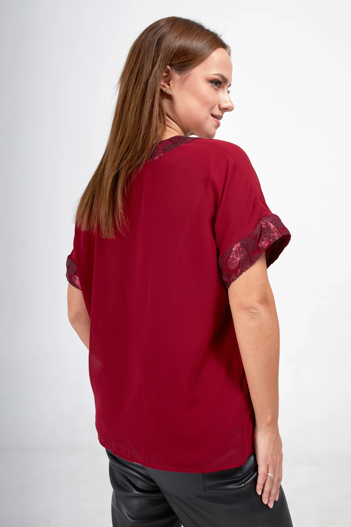 Особое внимание привлекает отделка из изысканного кружева с пайетками, которая добавляет блеска и утонченности. Эта блузка легко комбинируется с различными стилями одежды, будь то повседневный или более нарядный образ. Создайте свой уникальный стиль с этой великолепной блузкой, которая подчеркнёт вашу индивидуальность и сделает вас центром внимания!"