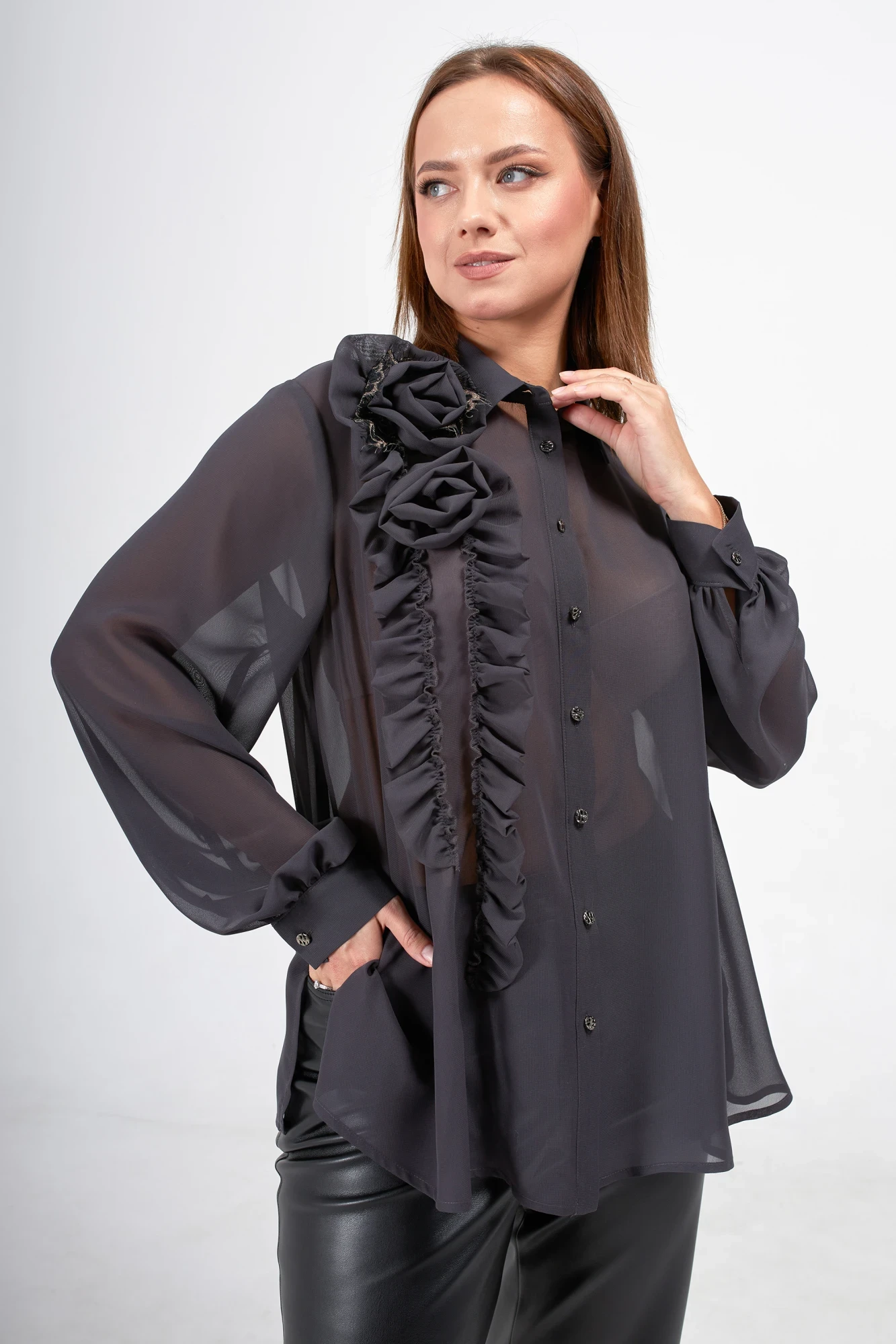 50,52, 54 , 56Воротник блузки отложной на стойке добавляет изысканности, а длинные втачные рукава с манжетами, застегивающимися на петли-пуговицы, делают эту модель стильной и комфортной. Эта блузка станет отличным дополнением к вашему гардеробу и подчеркнет ваш неповторимый стиль."