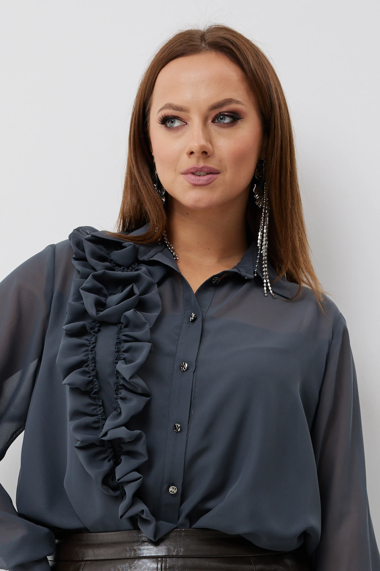 Воротник блузки отложной на стойке добавляет изысканности, а длинные втачные рукава с манжетами, застегивающимися на петли-пуговицы, делают эту модель стильной и комфортной. Эта блузка станет отличным дополнением к вашему гардеробу и подчеркнет ваш неповторимый стиль.