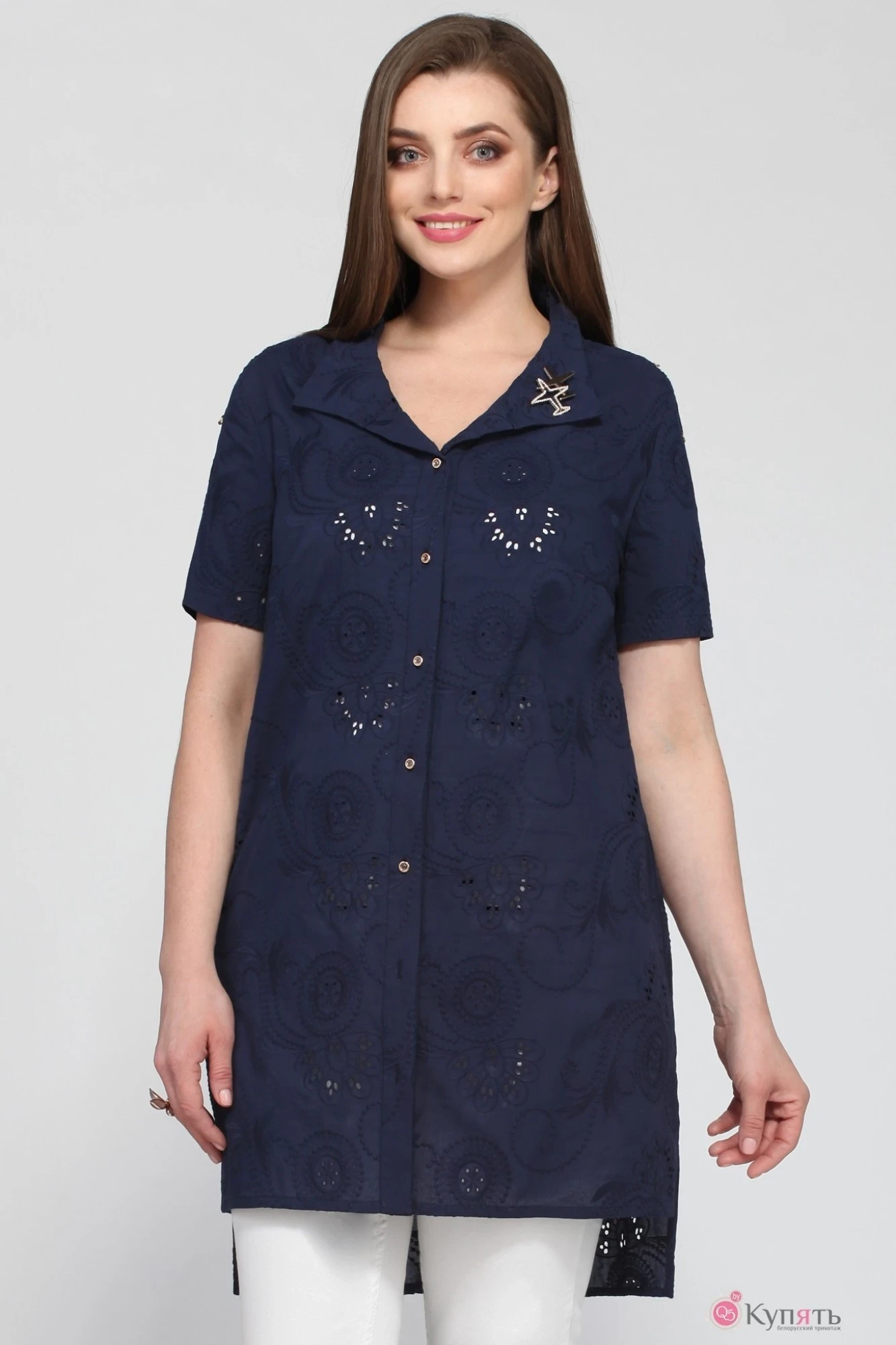 Блуза удлиненная с разрезами и карманами в боковом шве. Застежка центральная с отрезной планкой на петли пуговицы. Воротник стояче-отложной. Рукав втачной с отделочной деталью, украшенной пуговицами. Низ изделия и рукава обработаны швом в подгибку с закрытым срезом.