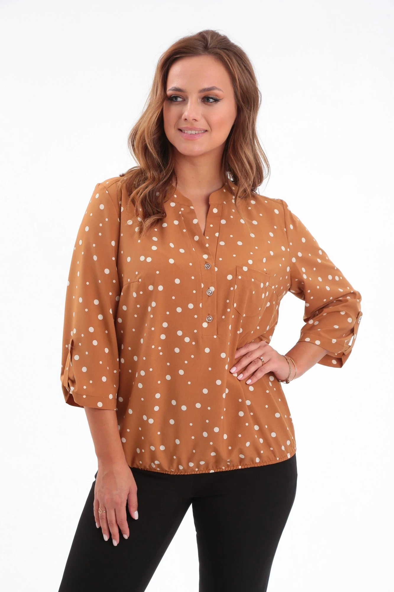 52,54, 56 ,58Женская блузка свободного силуэта с втачным рукавом. По переду изделия нагрудные вытачки и центральная планка, застегивающаяся на пуговицы. На левой полочке накладной карман. Спинка с кокеткой переходящей на полочку. По центру спинки сборка. Рукав короткий, прямой, втачной с патой на застежку пуговицу. По горловине плоско лежащий воротник-стойка. Низ блузки на резинке.