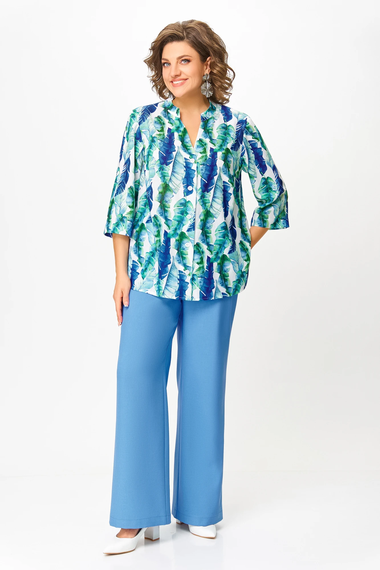 Блузка Swallow 852.2 Молочный, принт «сине-зелёные_листья»