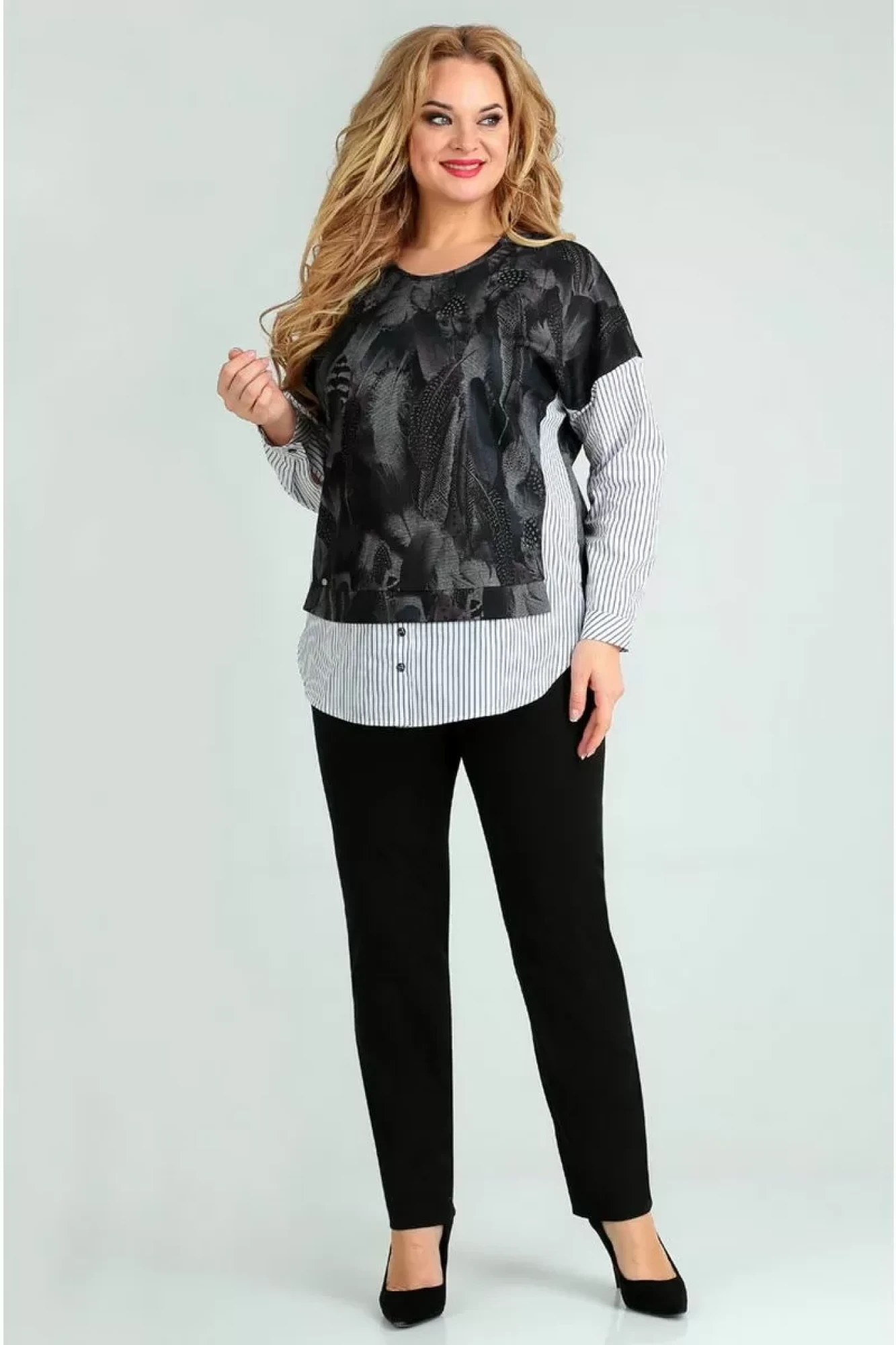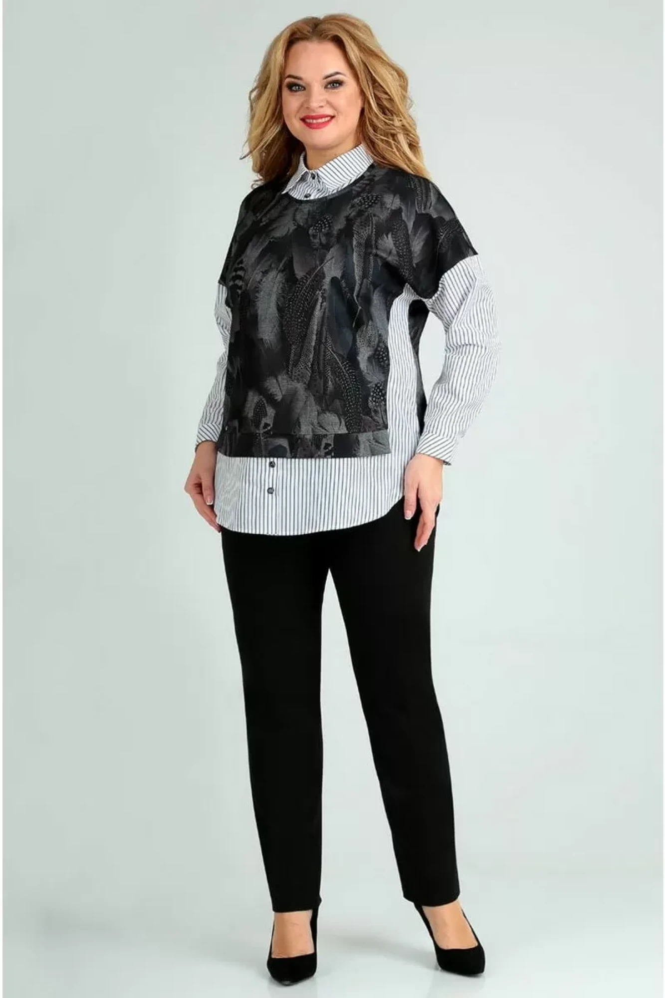 52,54, 56 , 58 ,60,62Изделие скомбинировано из трикотажного полотна и рубашечной, хлопковой ткани. Горловина углубленная, на бейке. Рукав рубашечный одношовный с притачным манжетом. Полочка по центру и бочкам притачивается к вставке, выполненной из хлопка, имитируя выглядывающую рубашку.