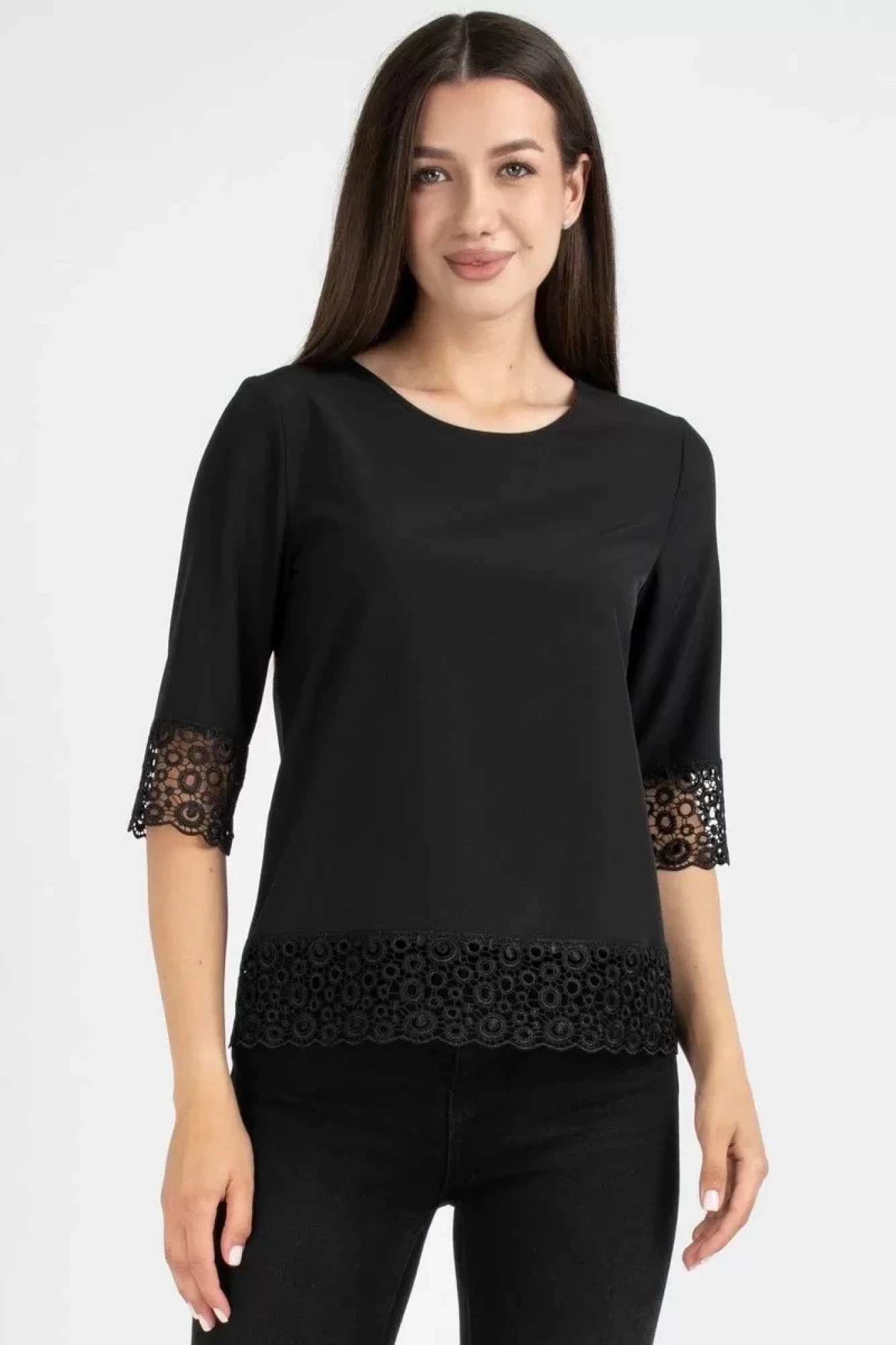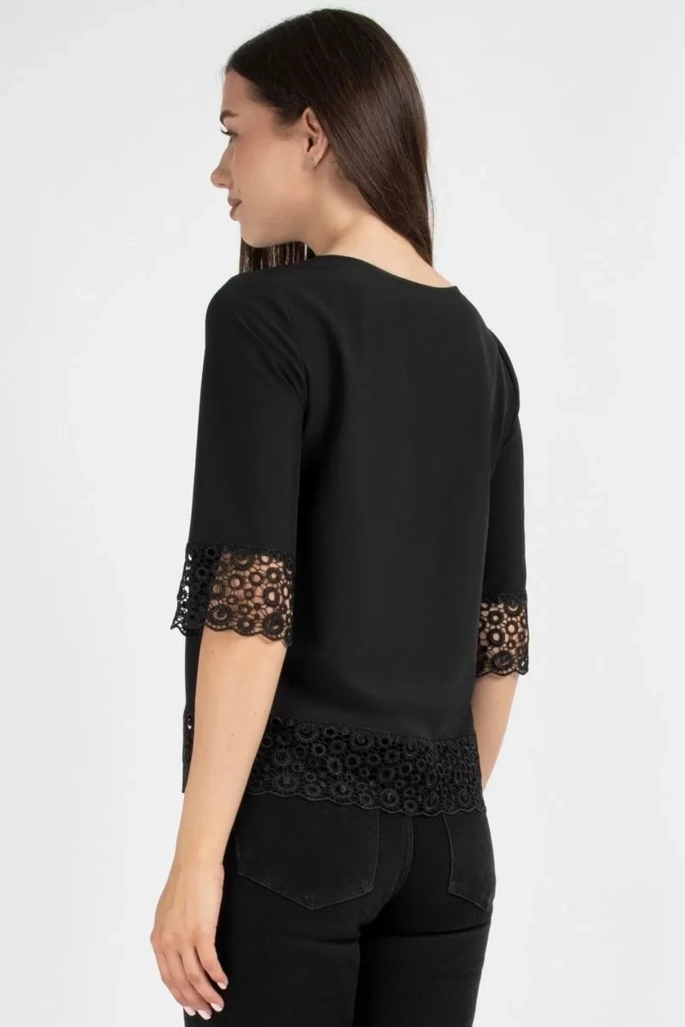 По низу переда спинки и рукава, настрочено отделочное кружево.