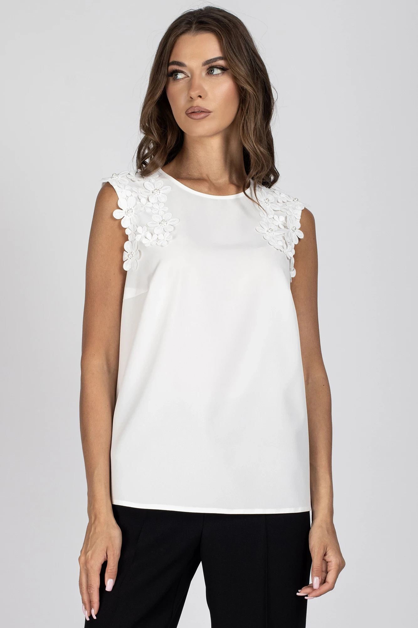 Отделочным элементом блузы является кружево, настроченное на верхней части переда и спинки. На кружево пришиты бусины.