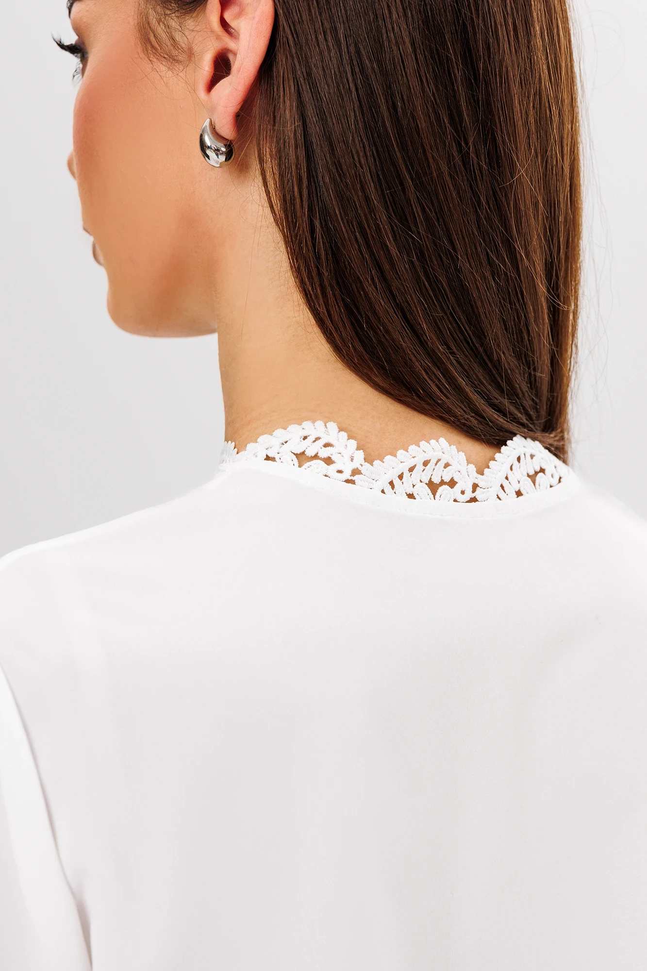 Передняя часть блузки с нагрудными вытачками, что подчеркивает женственность силуэта. Центральная бортовая застежка, выполненная из изысканного кружевного материала, добавляет нарядности и утонченности образу, создавая акцент на декольте.