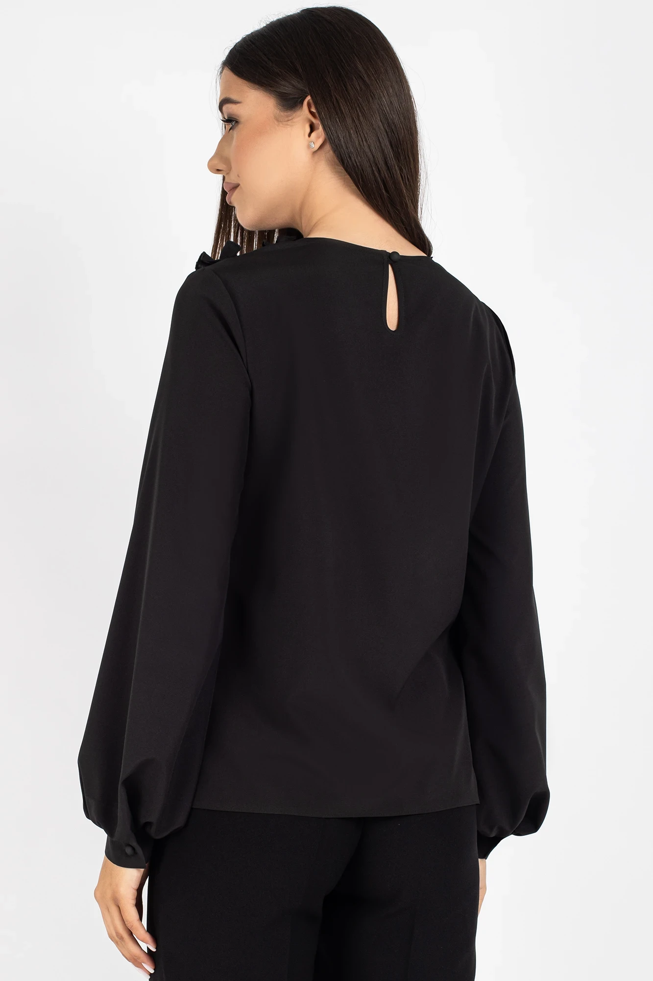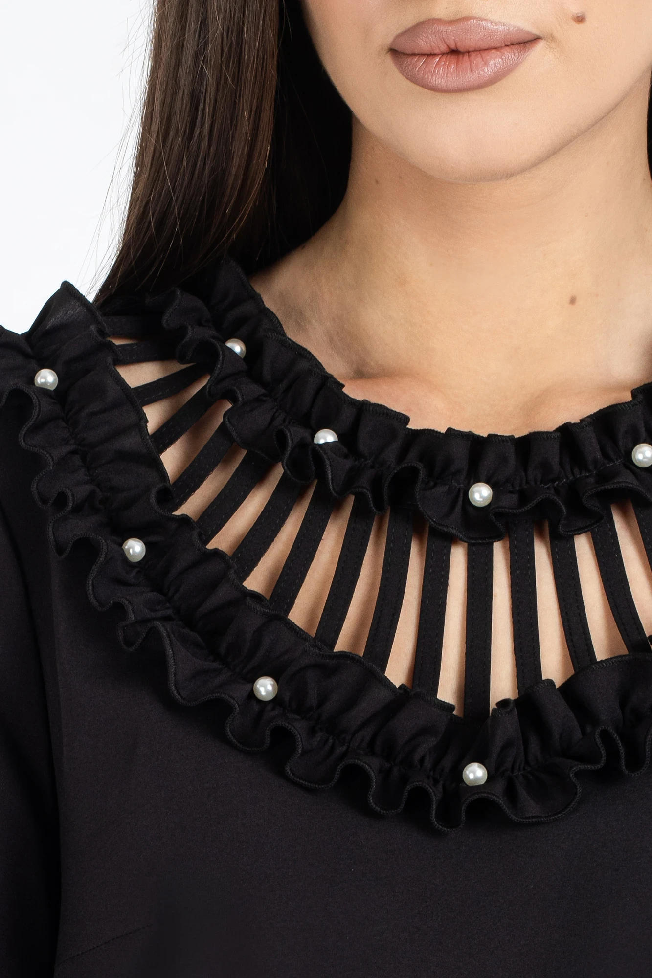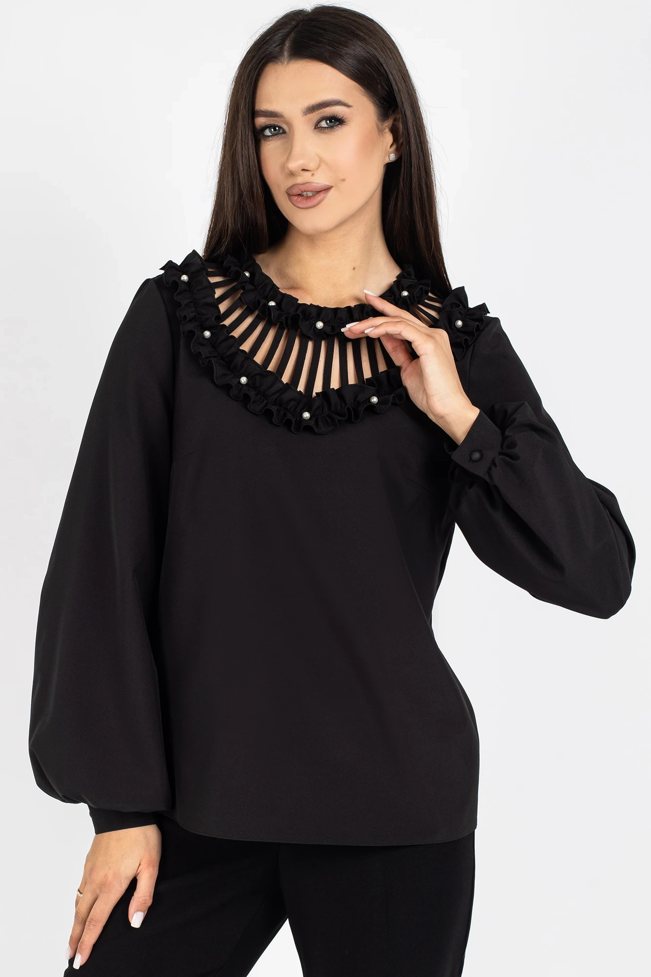 Отделочным элементом переда является V-образный вырез с планочками и настроченными рюшами.