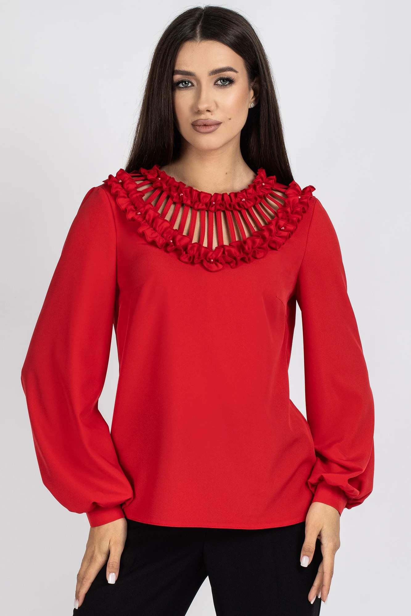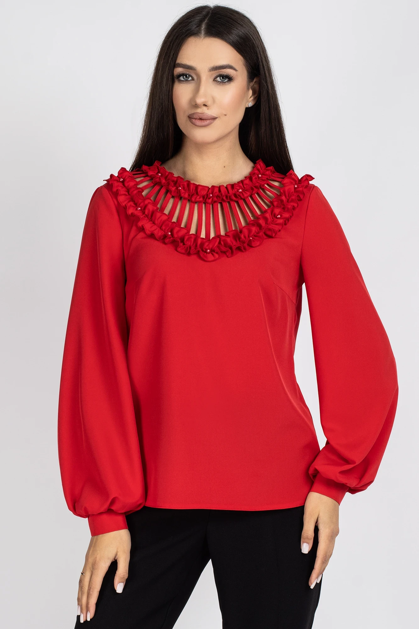 Отделочным элементом переда является V-образный вырез с планочками и настроченными рюшами.