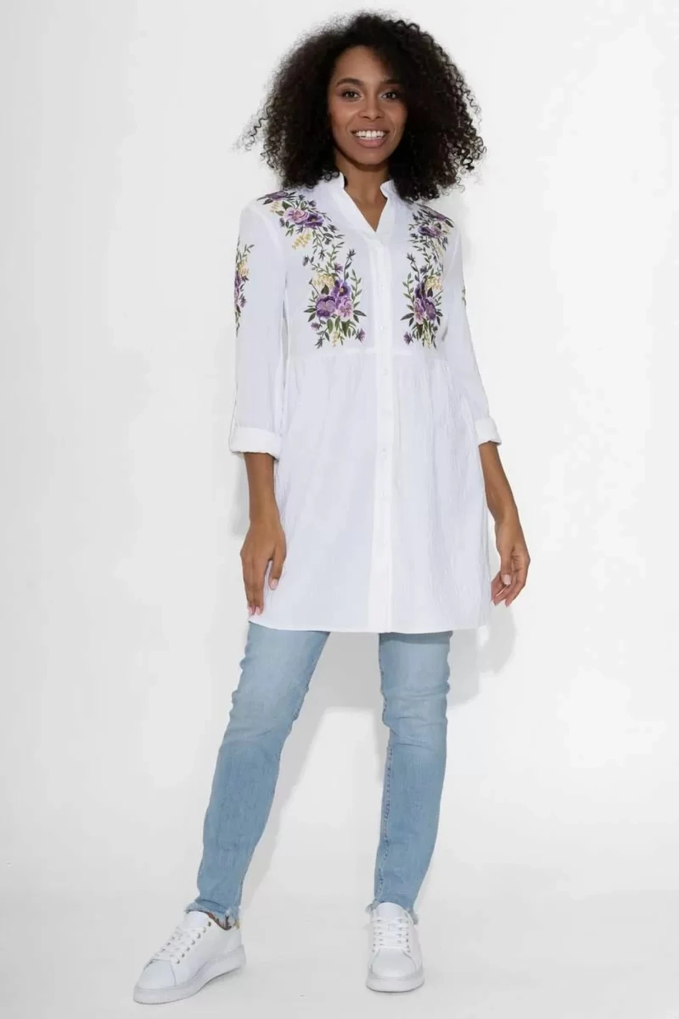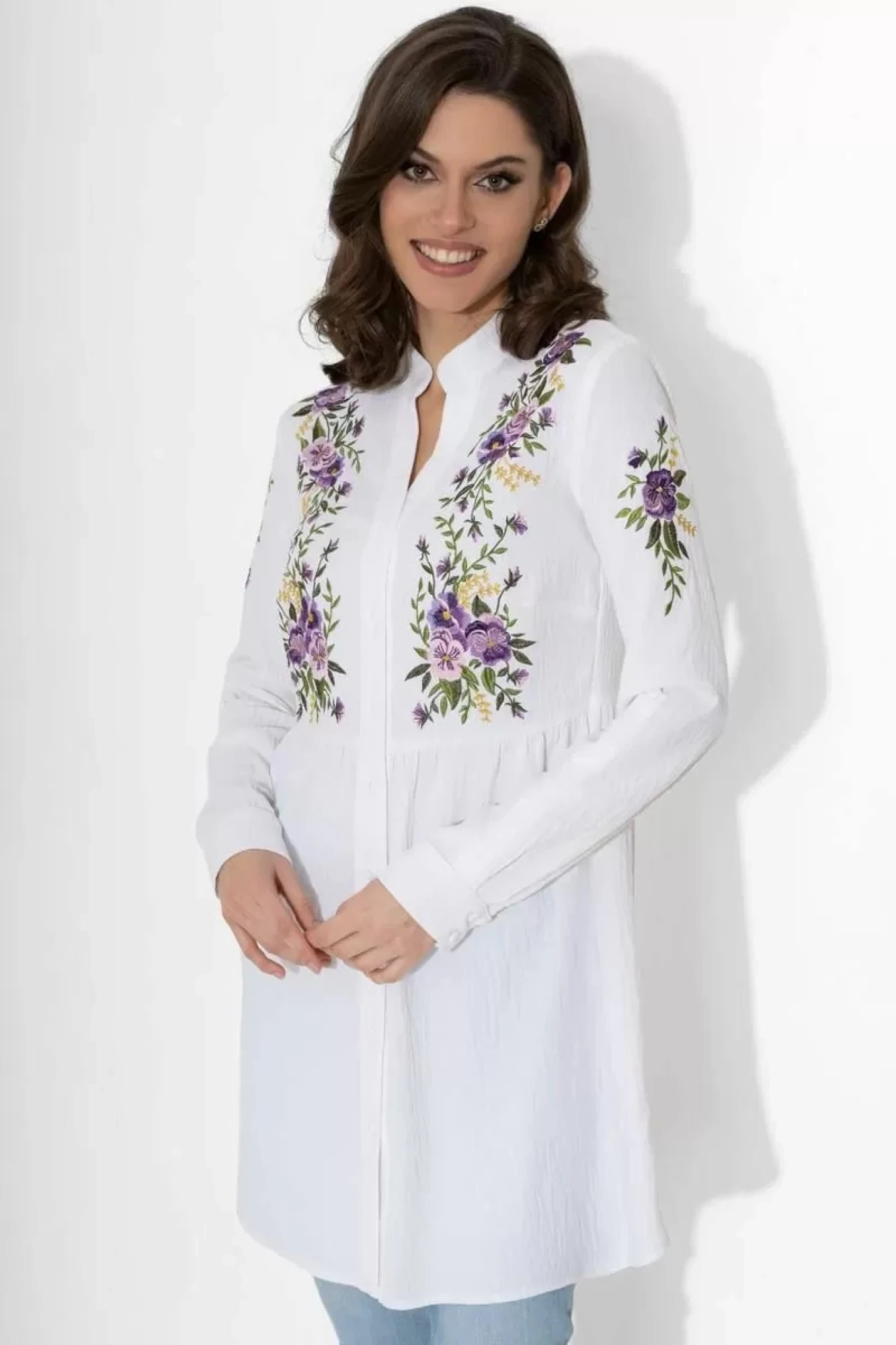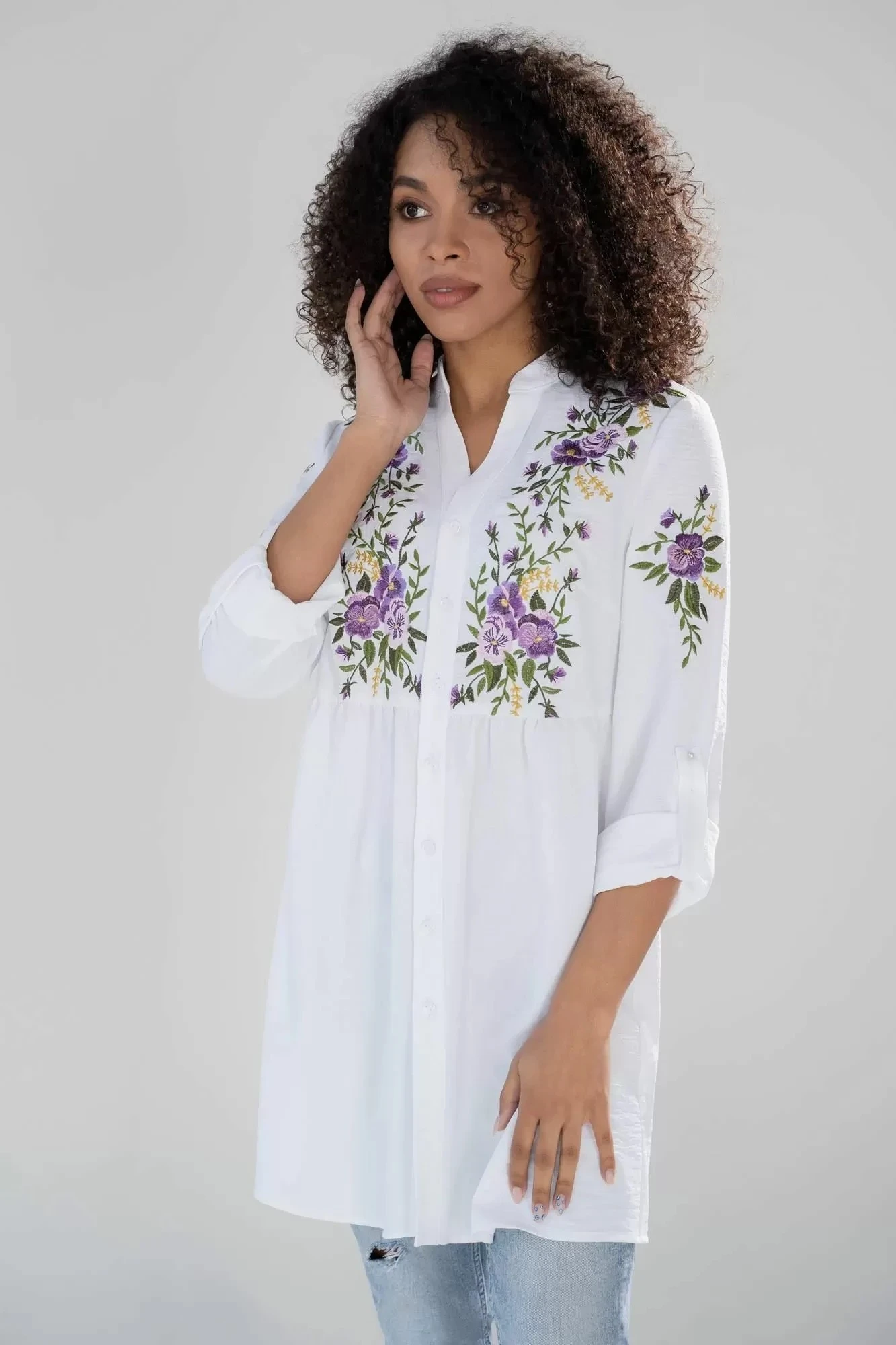 44, 46 ,48, 50 ,52,54,56Перед блузки с нагрудной вытачкой, с V-образной застежкой-планкой на семь петель пуговиц. Верхние детали полочки с симметричной вышивкой.