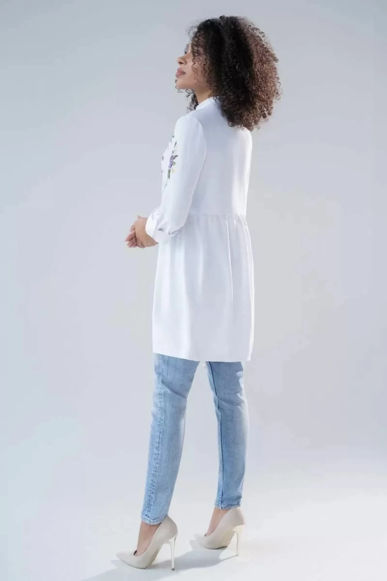 Рукав втачной, одношовный рубашечного типа, длинный. Низ рукава с двумя складками и окантованным разрезом обработан притачной манжетой, застегивающейся на две петли и пуговицы. Рукав с патой, застегивается на 1 петлю и пуговицу (размер и цвет фурнитуры может незначительно отличаться от фото). В верхней части рукава расположена вышивка.