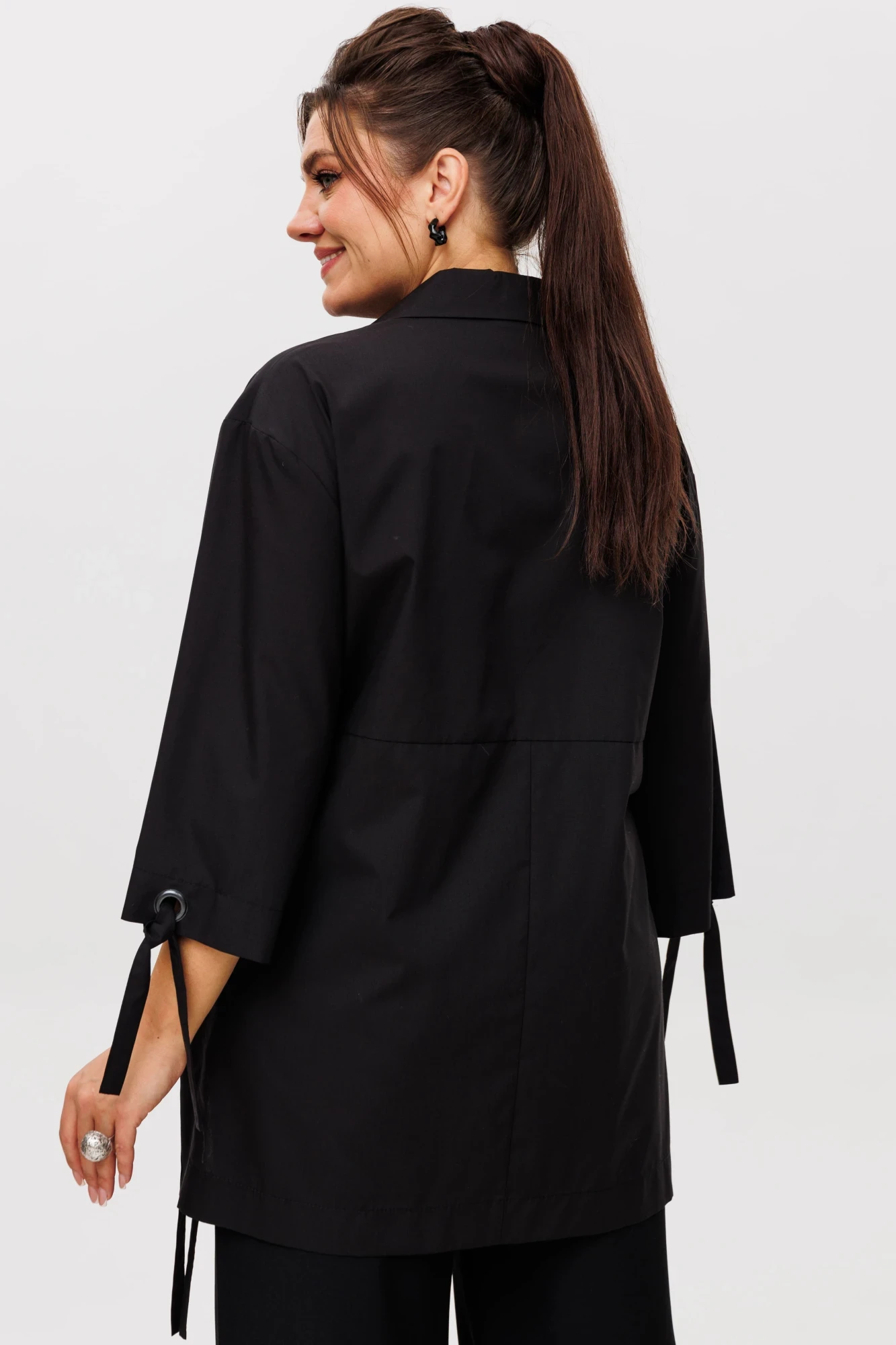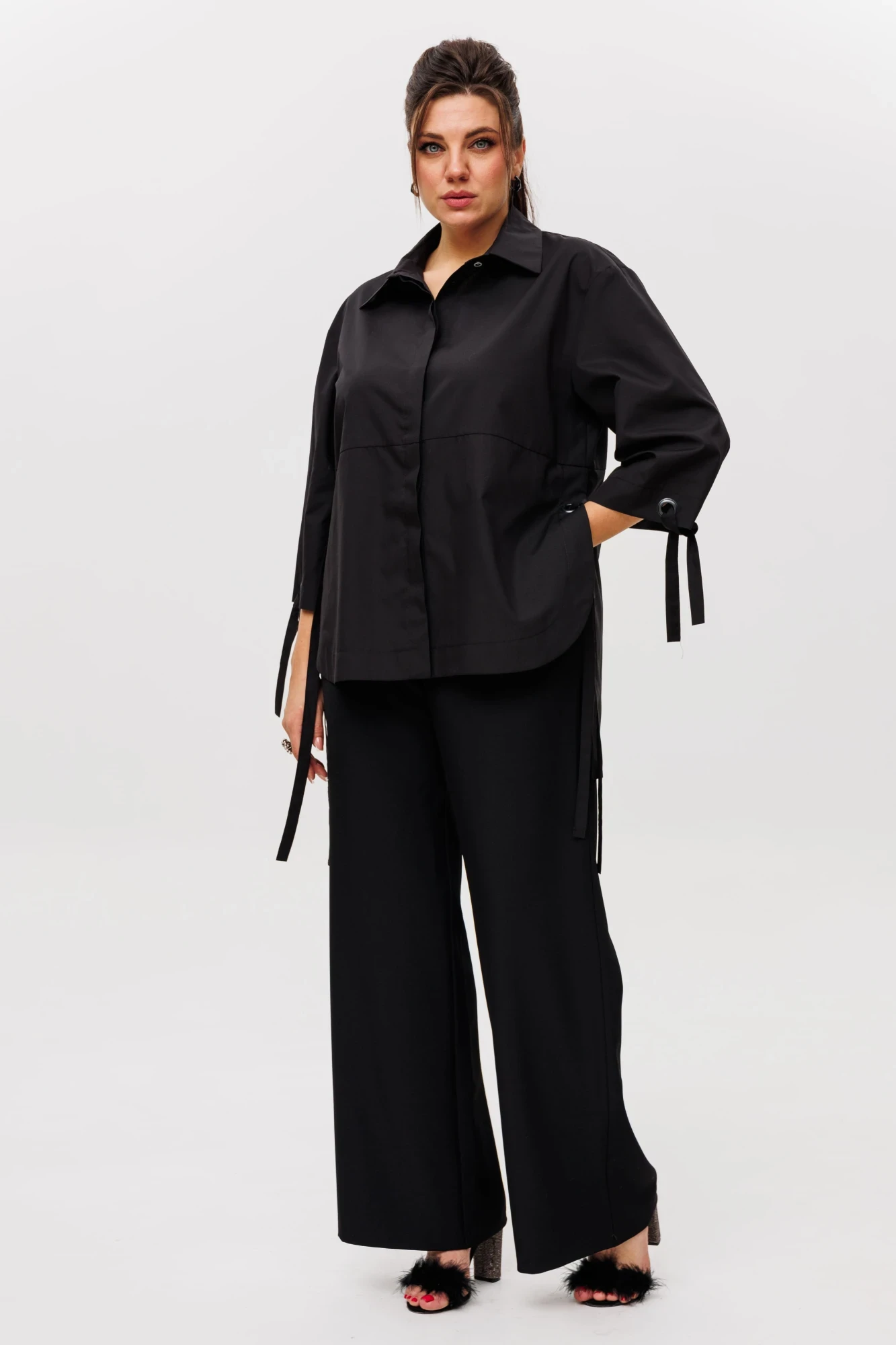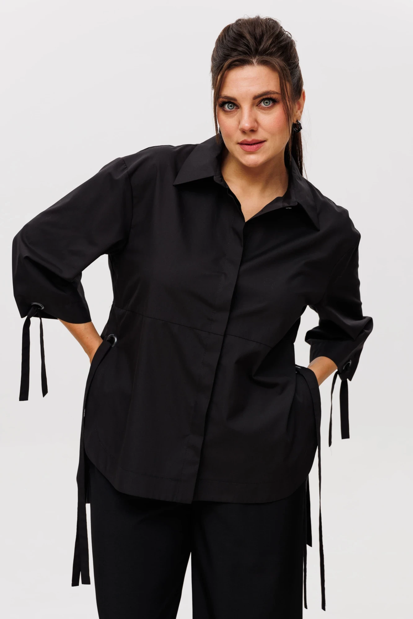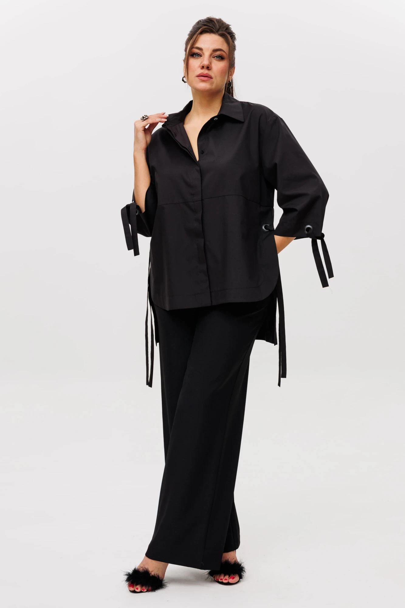 Особое внимание привлекают декоративные элементы — люверсы и завязки, которые придают рубашке оригинальный характер, делая её не просто базовой вещью, а настоящей изюминкой вашего гардероба.