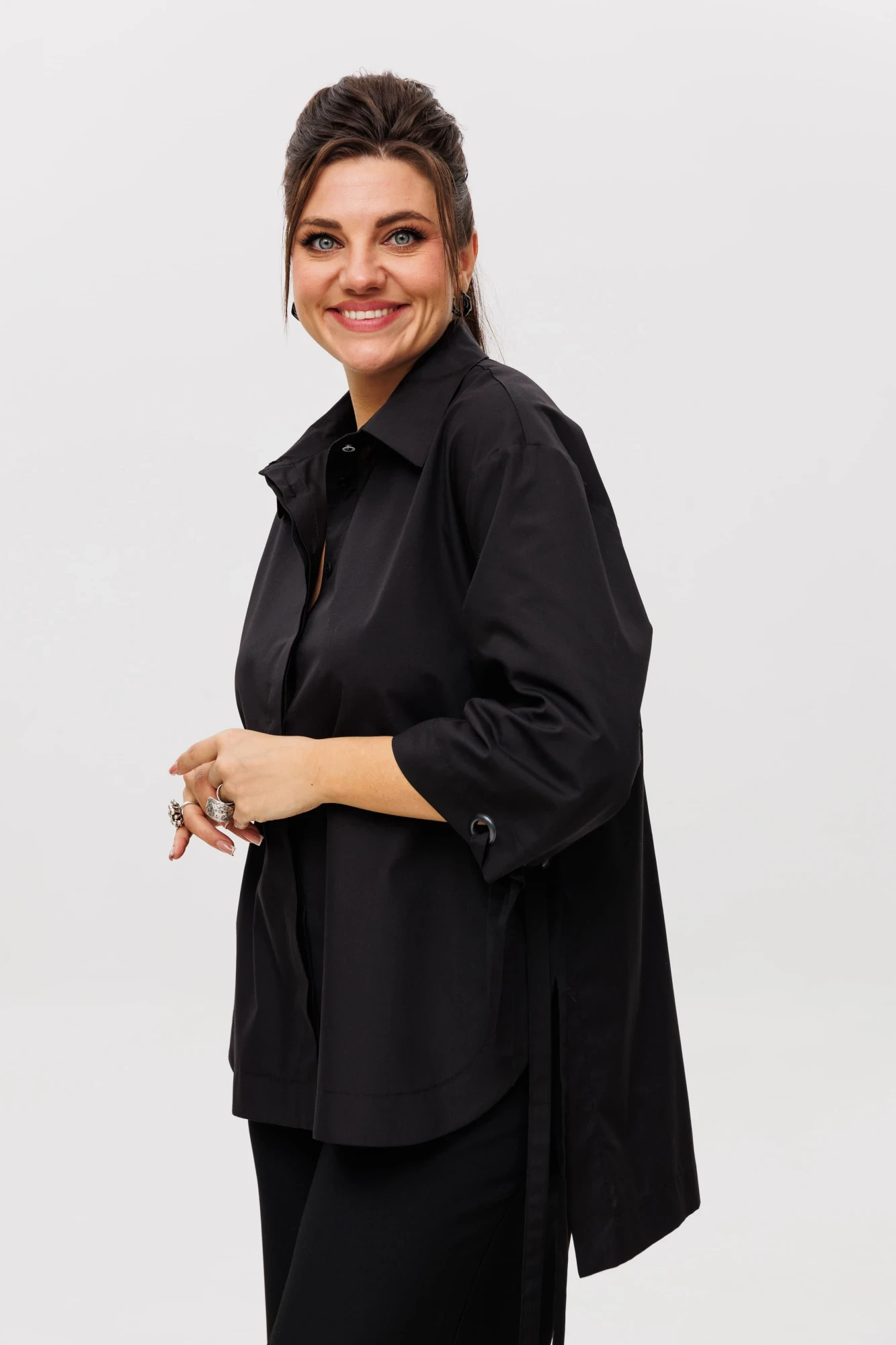 Благодаря спущенным плечам и удлиненной спинке, она создает расслабленный силуэт, идеально подходящий как для офиса, так и для прогулок по городу. Неровный низ добавляет динамичности образу, а потайная застежка сохраняет элегантный и сдержанный вид.
