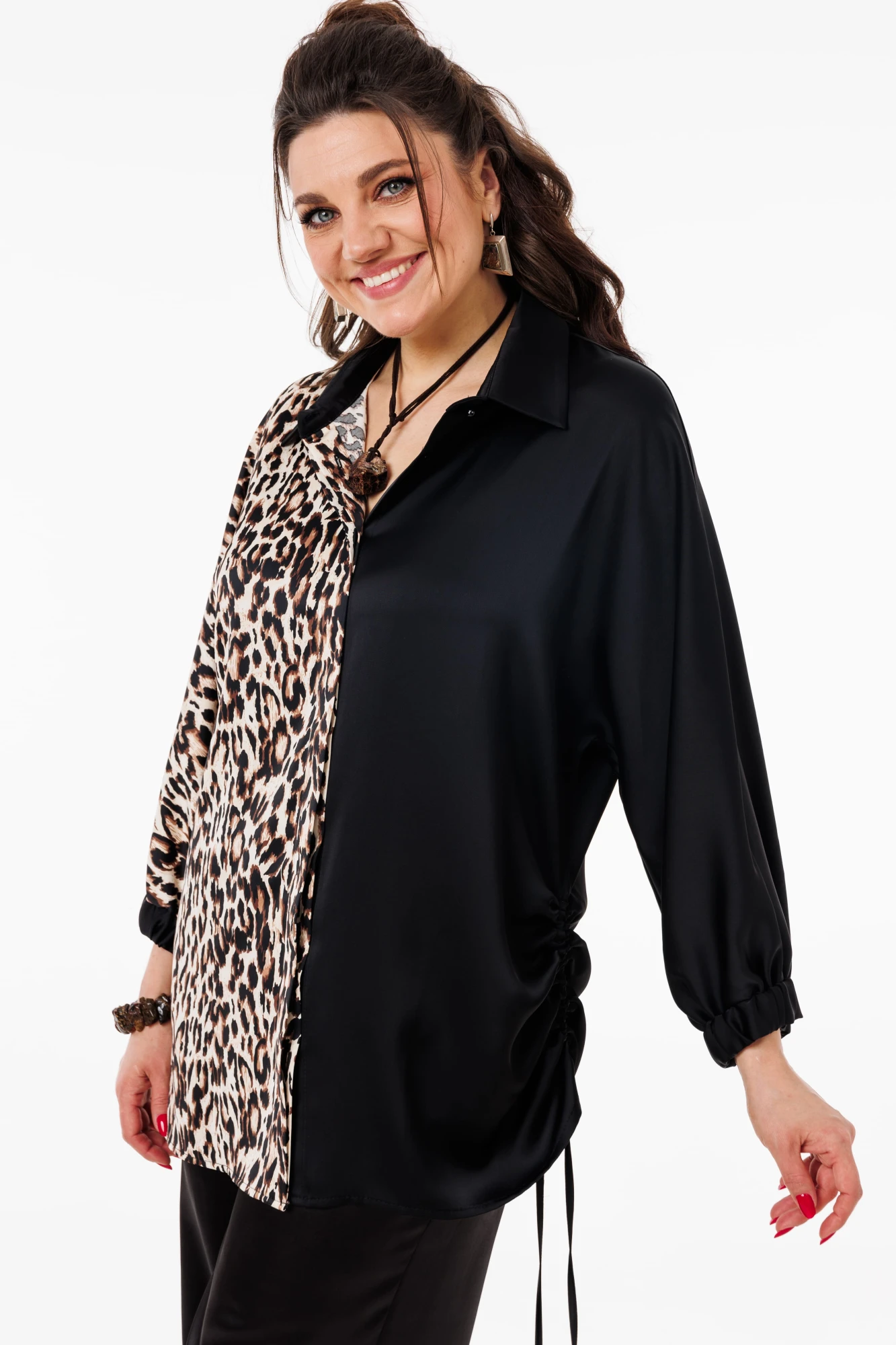 На модели в блузе с леопардовым принтом леопардовая юбка 1291 и брюки из атласа 1425.1.