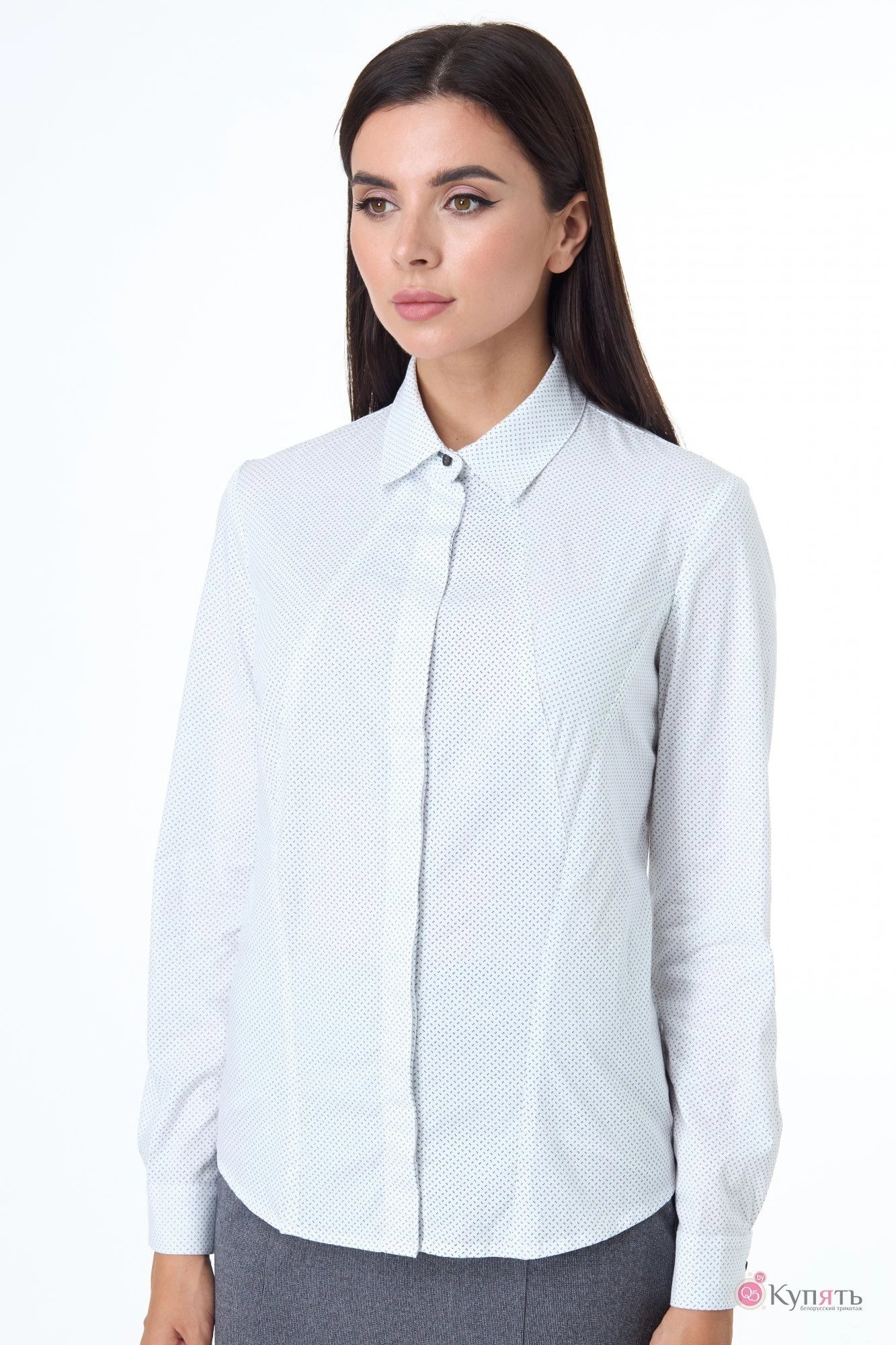 Полуприлегающий силуэт с выверенными рельефами по переду. Отложной воротник на стойке. Застежка потайная на пуговицы. Втачные короткие рукава с отворотом.