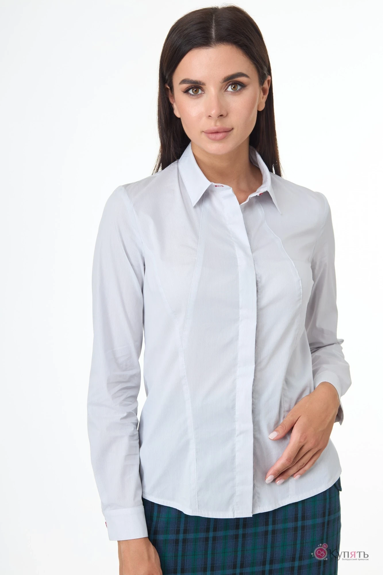 42,44,46,48, 50 ,52Полуприлегающий силуэт с выверенными рельефами по переду. Отложной воротник на стойке. Застежка потайная на пуговицы. Втачные короткие рукава с отворотом.
