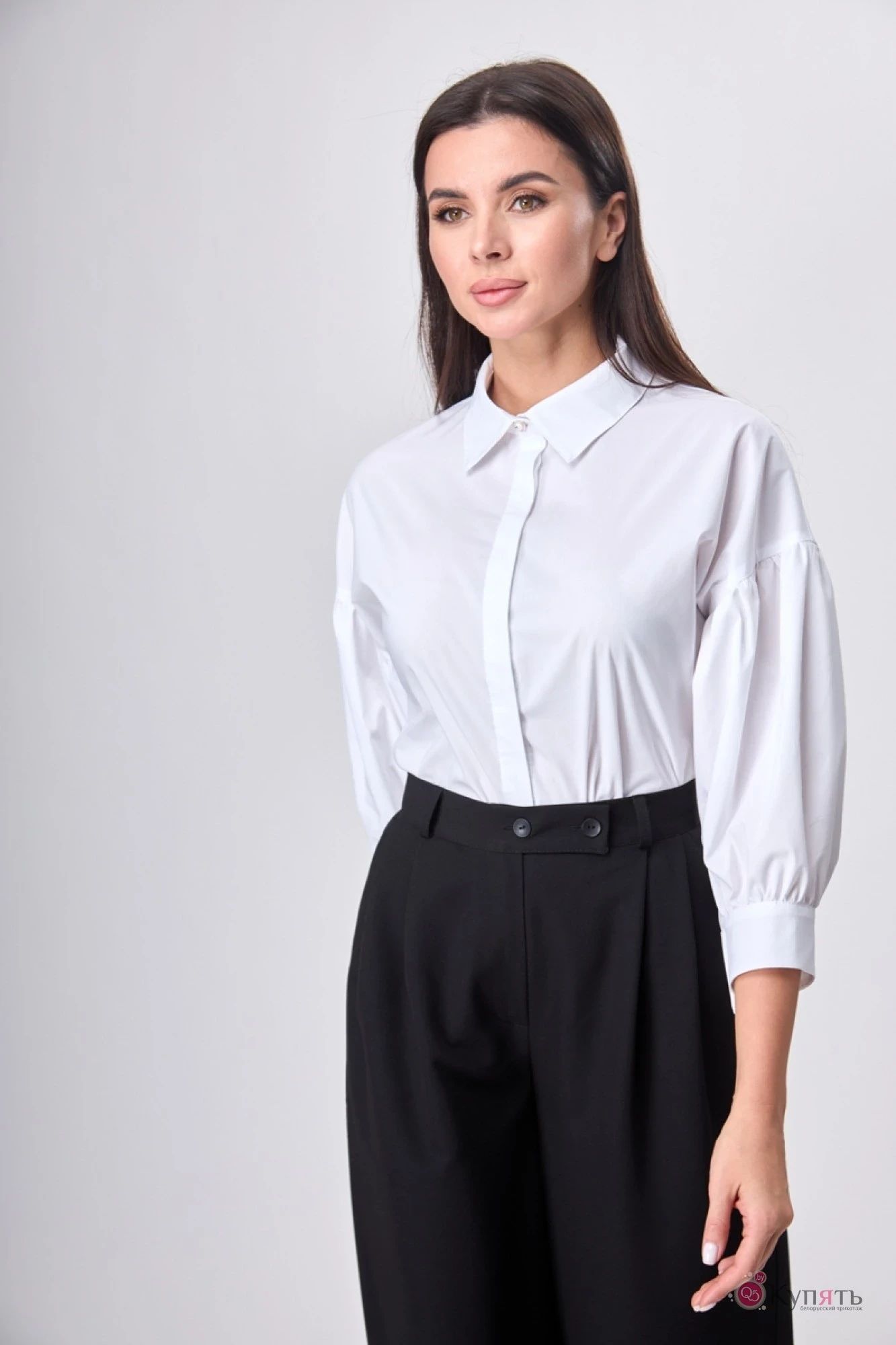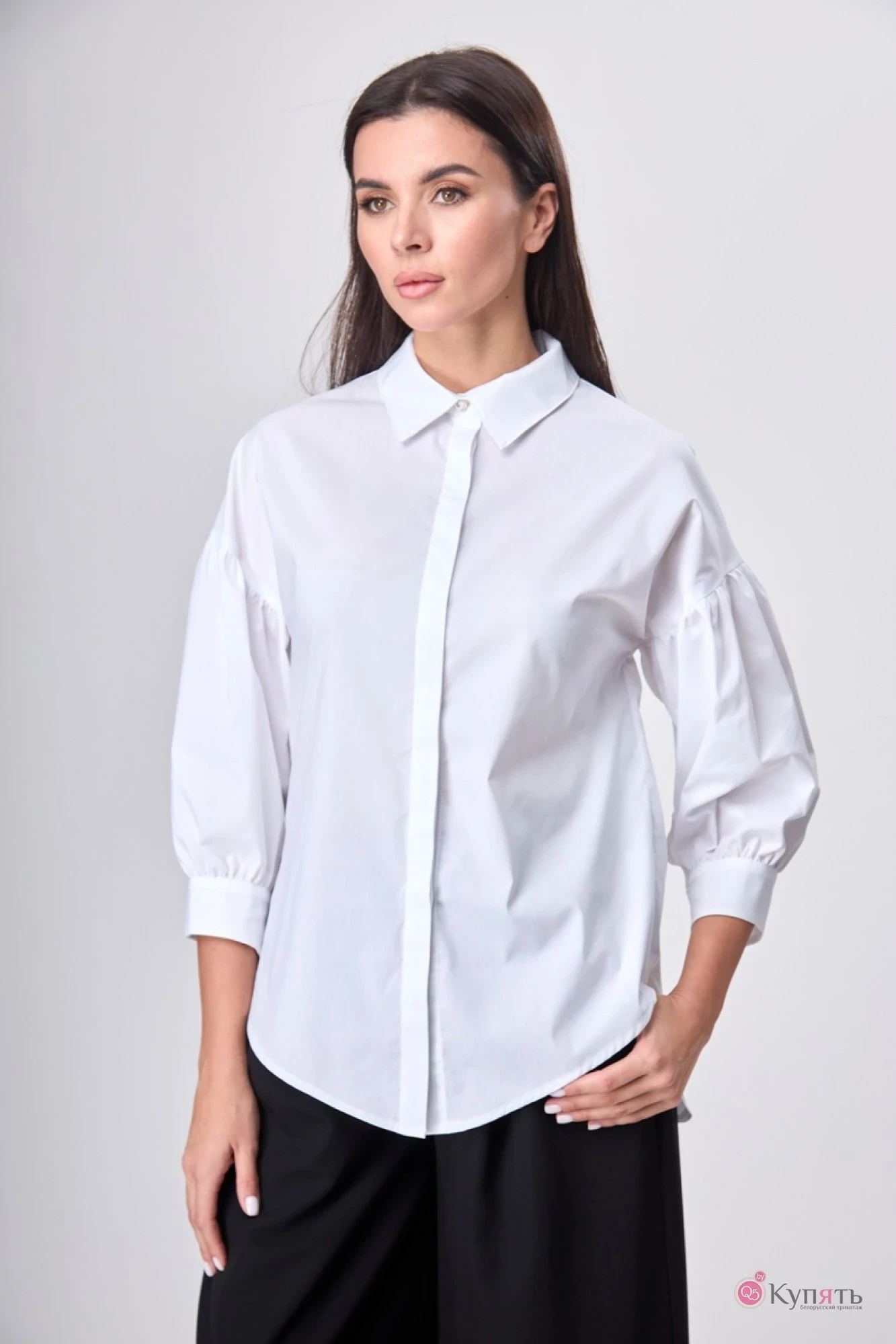 Красивый 3/4 рукав со сборкой вверху и по низу на манжете.Рубашечный воротник на притачной стойке,потайная застежка на пуговицы по всей длине блузы.