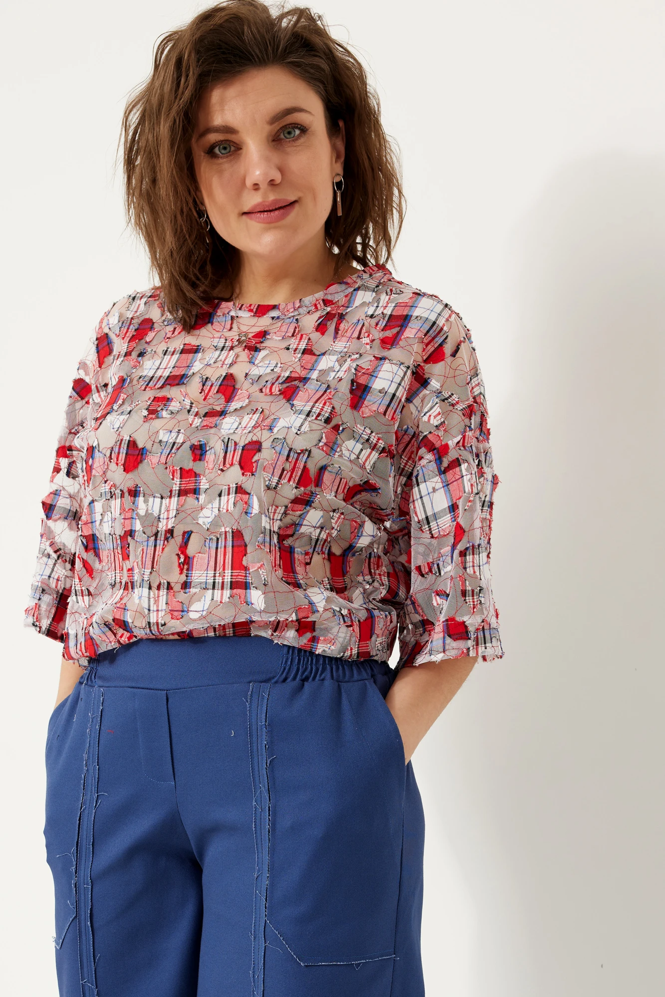 Блуза великолепно сочетается с брюками и юбками из денима, как брюки арт. 6062, представленные на фото.