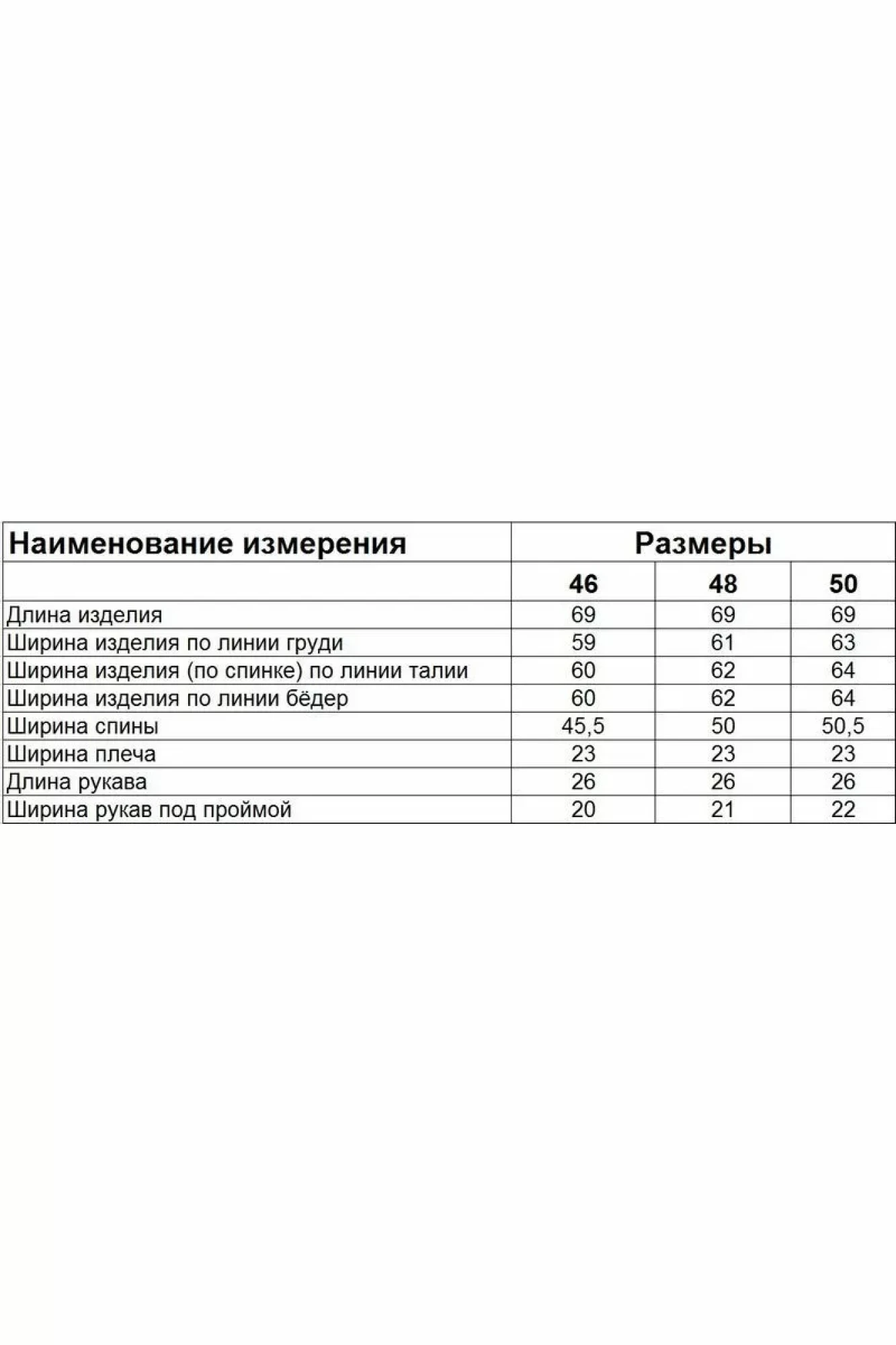 46,48,50Длина по спинке 69 см, длина рукава 26 см.