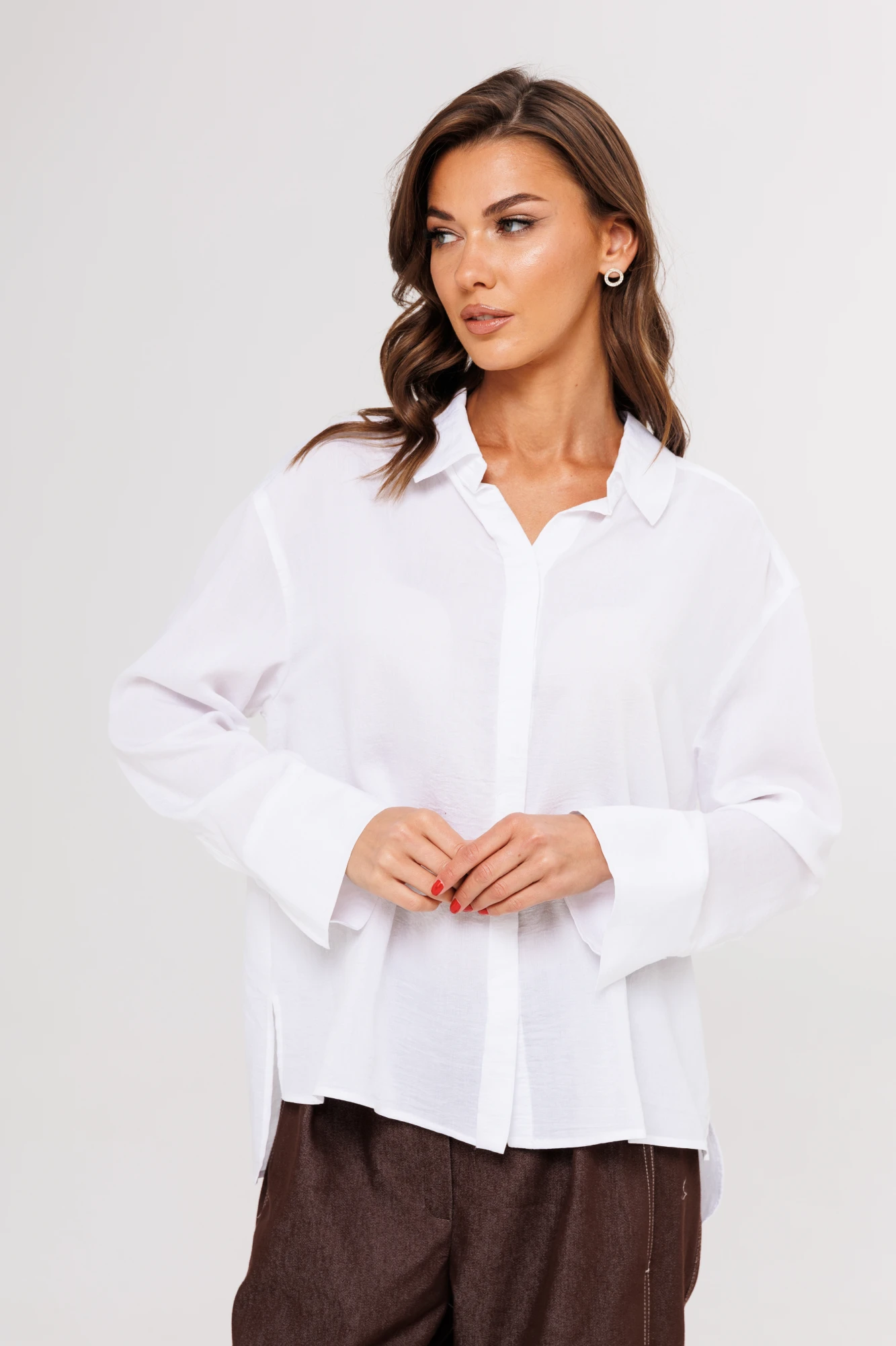 Свободный силуэт, рубашечный покрой, центральная потайная застежка на петли и пуговицы, воротник рубашечный с отрезной стойкой, рукав рубашечный с отрезной манжетой и разрезом в области локтевого шва. Спинка с отрезной кокеткой и двумя мягкими складками.