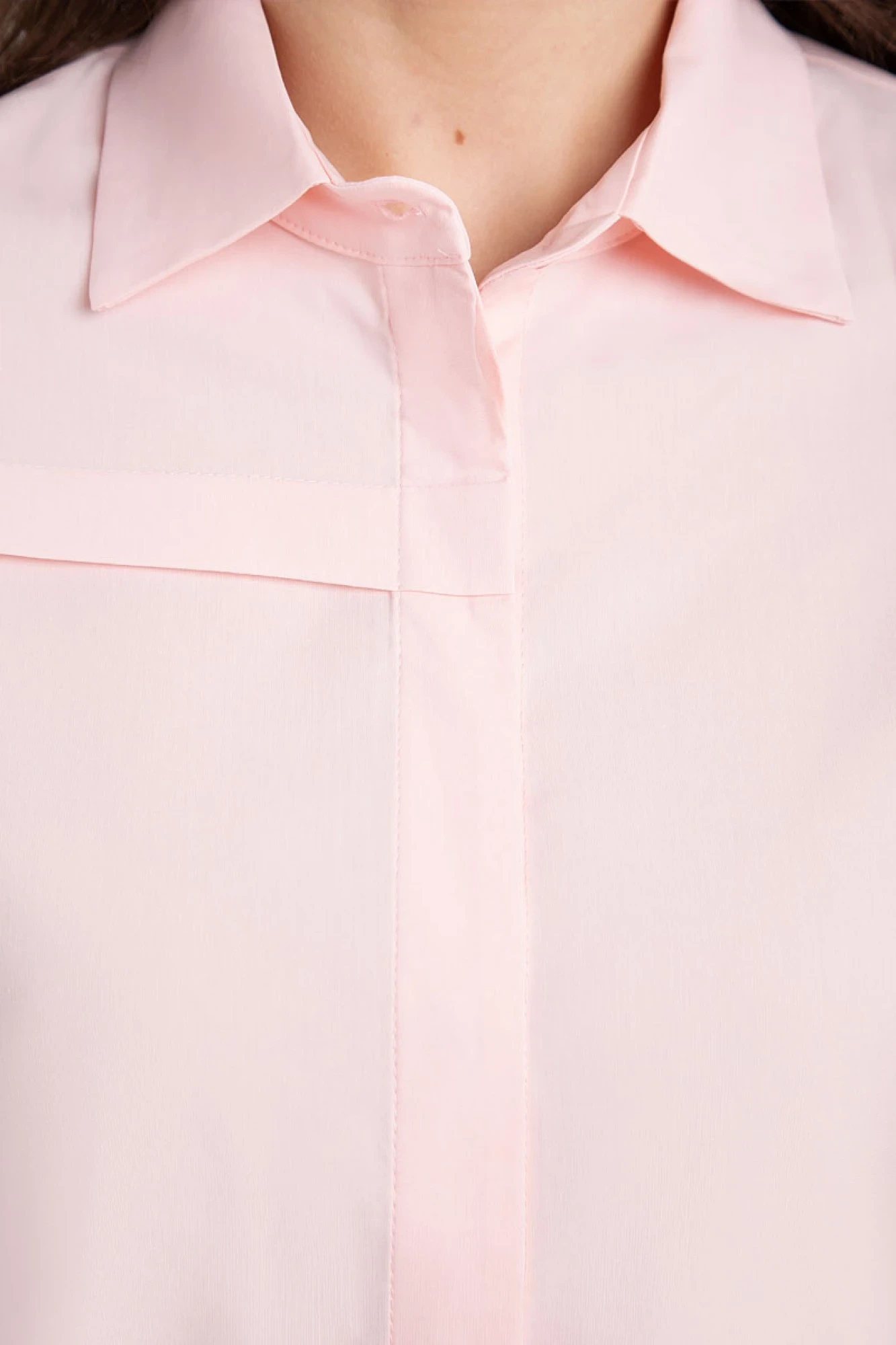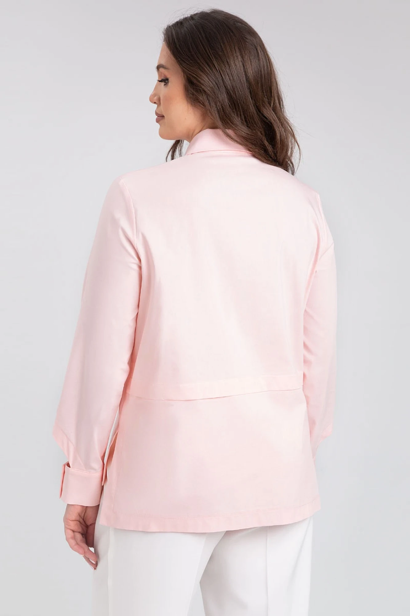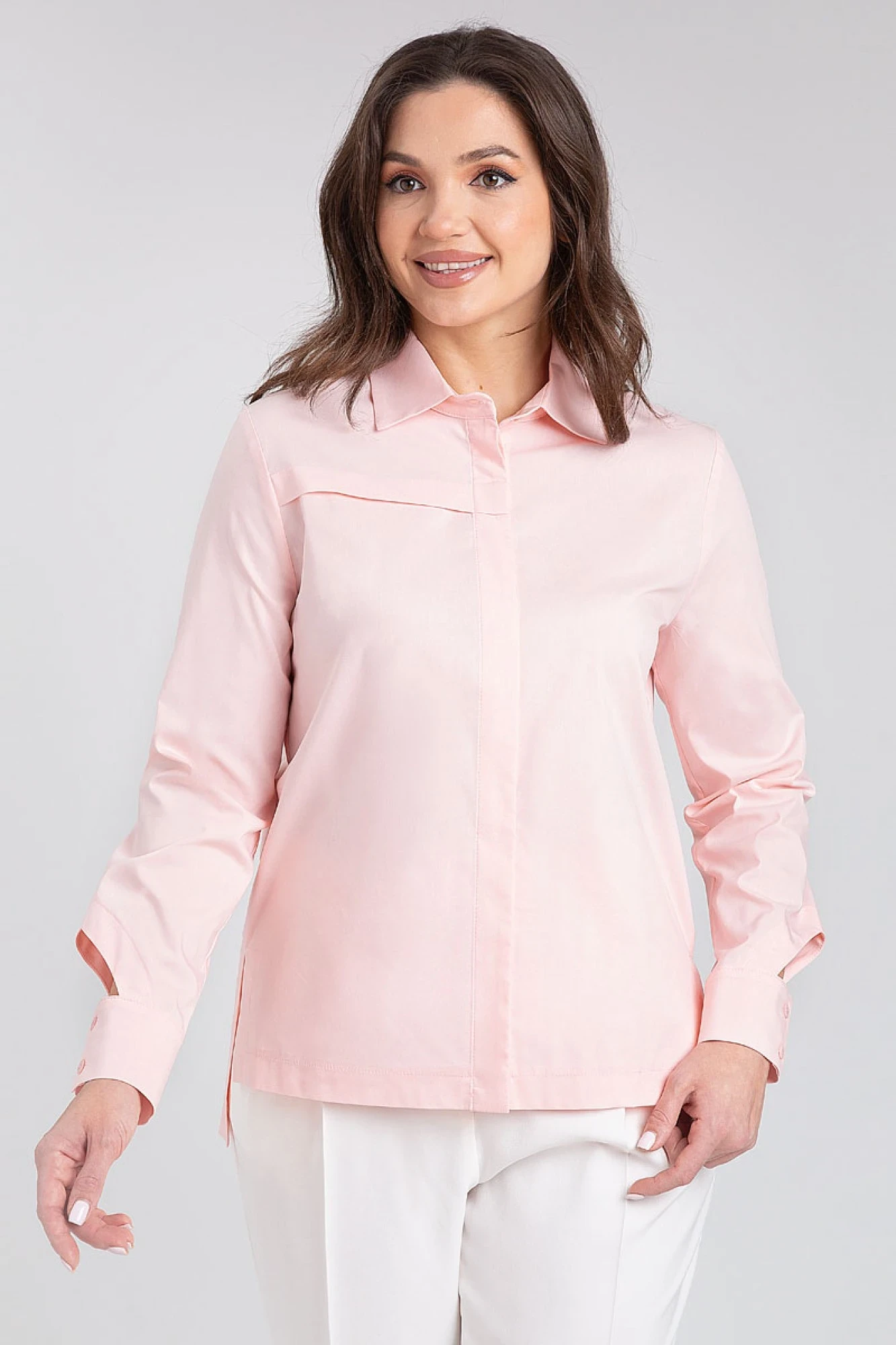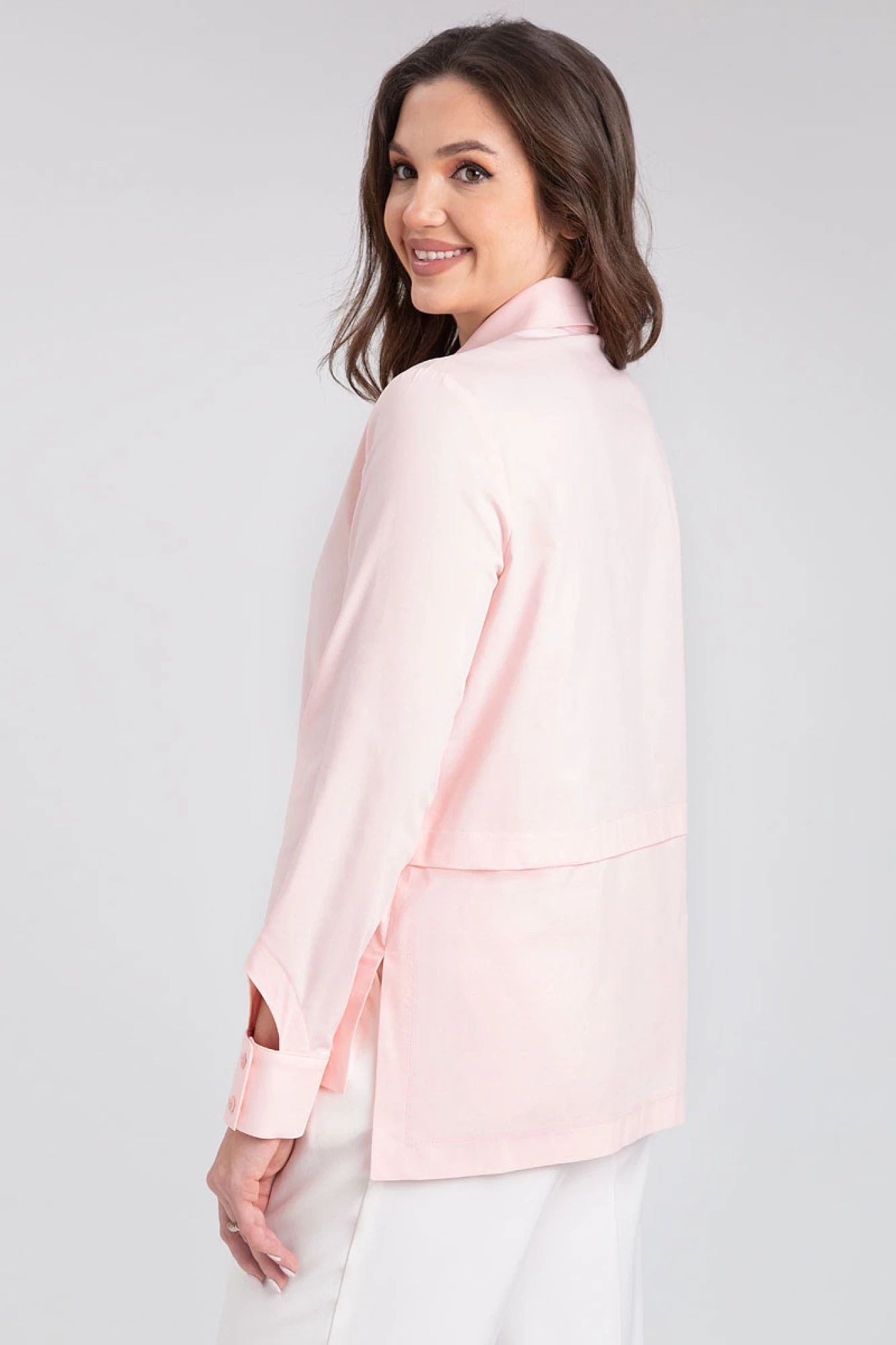 46,48, 50 , 52 , 54 , 56 , 58Центральная застежка на пуговицы в потайной планке. Отложной воротник-стойка. Передняя правая полочка с декоративной горизонтальной планкой. Притачные рукава с декоративным фигурным вырезом, на высокой манжете с застежкой на пуговицы.