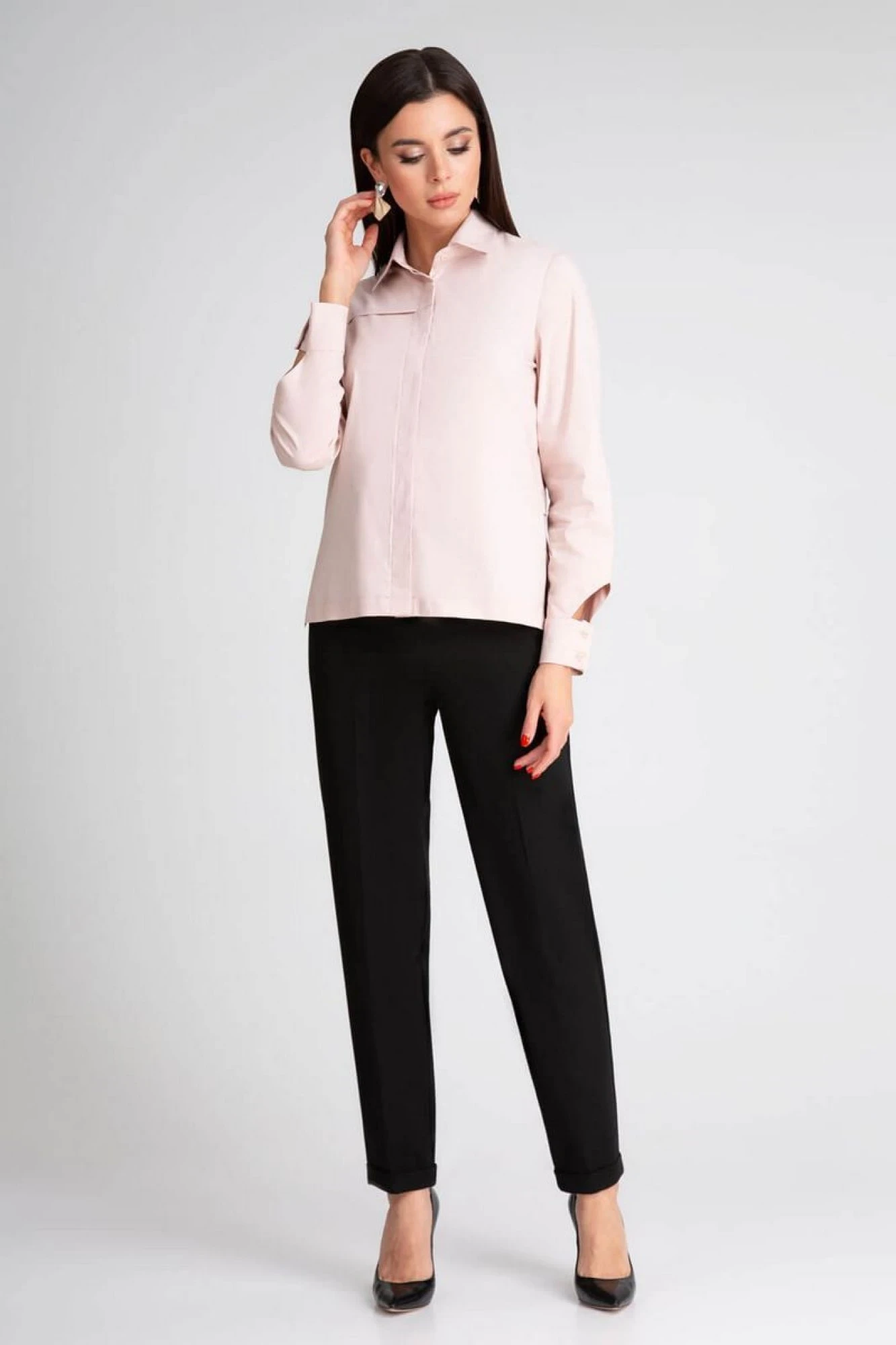 42,44,46,48,50,52,54,56, 58Центральная застежка на пуговицы в потайной планке. Отложной воротник-стойка. Передняя правая полочка с декоративной горизонтальной планкой. Притачные рукава с декоративным фигурным вырезом, на высокой манжете с застежкой на пуговицы.