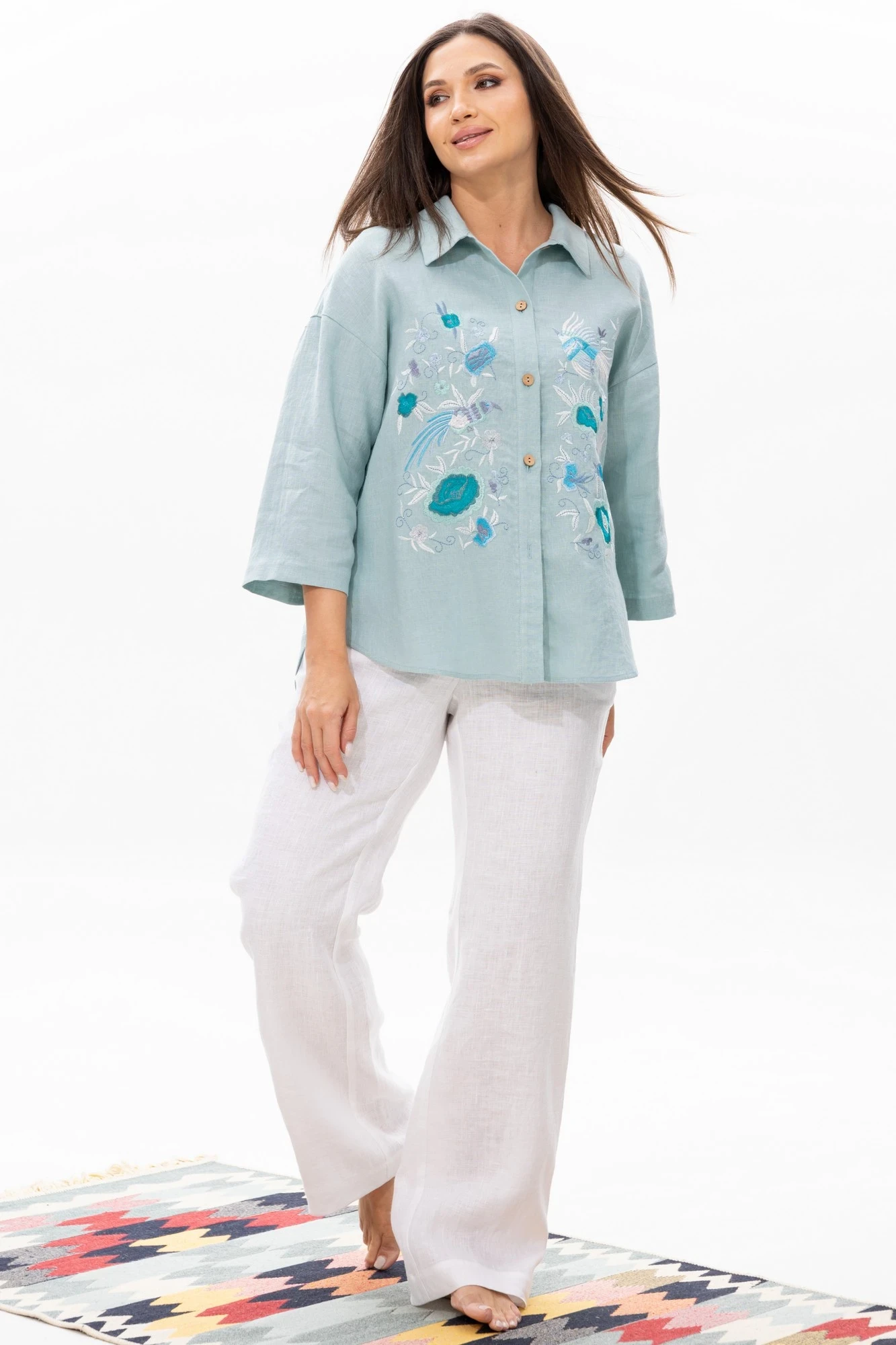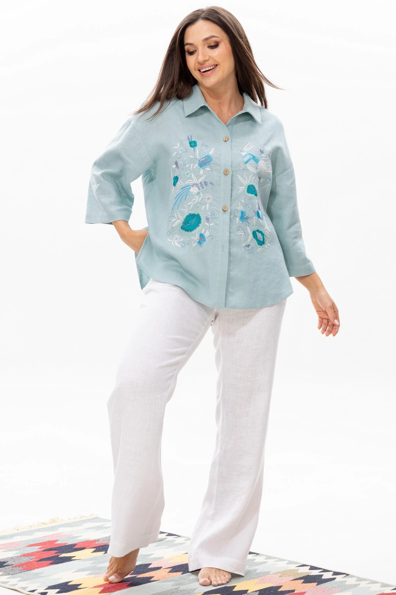 Воротник отложной рубашечного типа. Застежка центральная на петли и пуговицы, спинка с кокеткой. На полочке расположены две симметричные дизайнерские вышивки. Рукав 3/4 со спущеной линией плеча, одношовный.