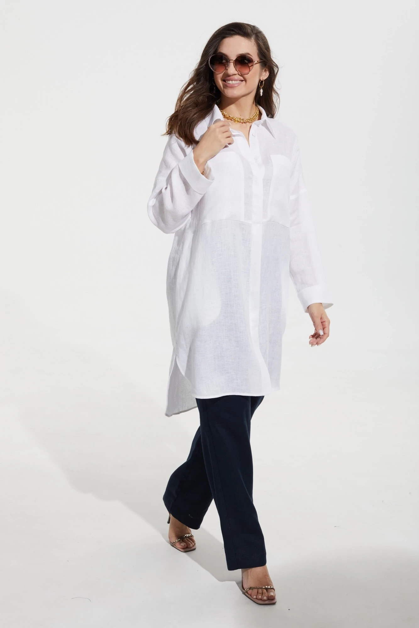 На спинке кокетка. Воротник рубашечного типа на отрезной стойке. Рукав длиной 3/4, втачной одношовный рубашечного типа с притачной отложной манжетой по низу. Низ фигурной формы с закруглениями по бокам и удлиненной спинкой.