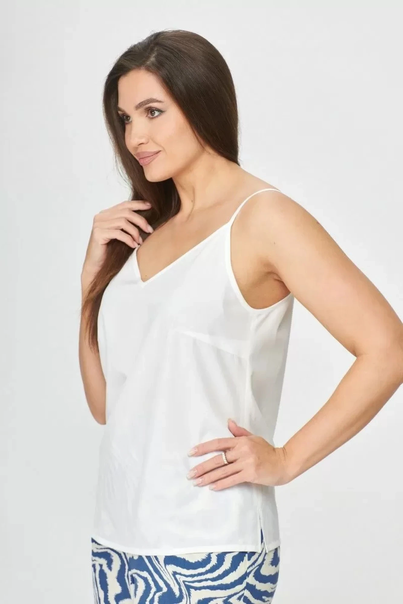 Этот топ выполнен из эластичной блузочной ткани, которая легко дышит и охлаждает, что делает его комфортным для жаркой погоды. Срезы горловины и проймы мягко окантованы, что придает топу нежный вид и обеспечивает дополнительный комфорт.